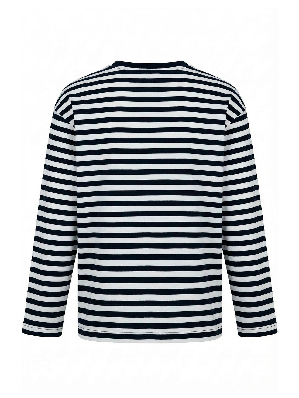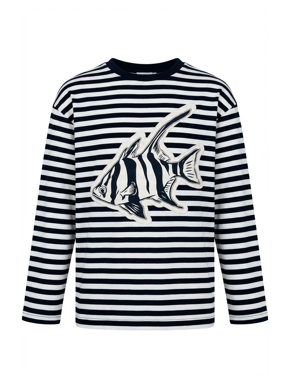 Лонгслив в полоску для мальчиков в морском стиле. Модель в классическую сине-белую полоску с длинным рукавом выполнена из мягкого хлопкового трикотажа с круглым вырезом горловины, отделанной темно-синей окантовкой. На груди — крупный принт с изображением полосатой тропической рыбки, гармонично вписывающийся в морскую тематику дизайна. Принт выполнен в контрастных бело-синих тонах. Лонгслив – это универсальная базовая вещь для повседневного гардероба. Отлично сочетается с джинсами, брюками и шортами. Комфортный крой обеспечивает свободу движений. Качественный материал сохраняет форму и яркость после стирок. Идеален для весенне-летнего сезона.