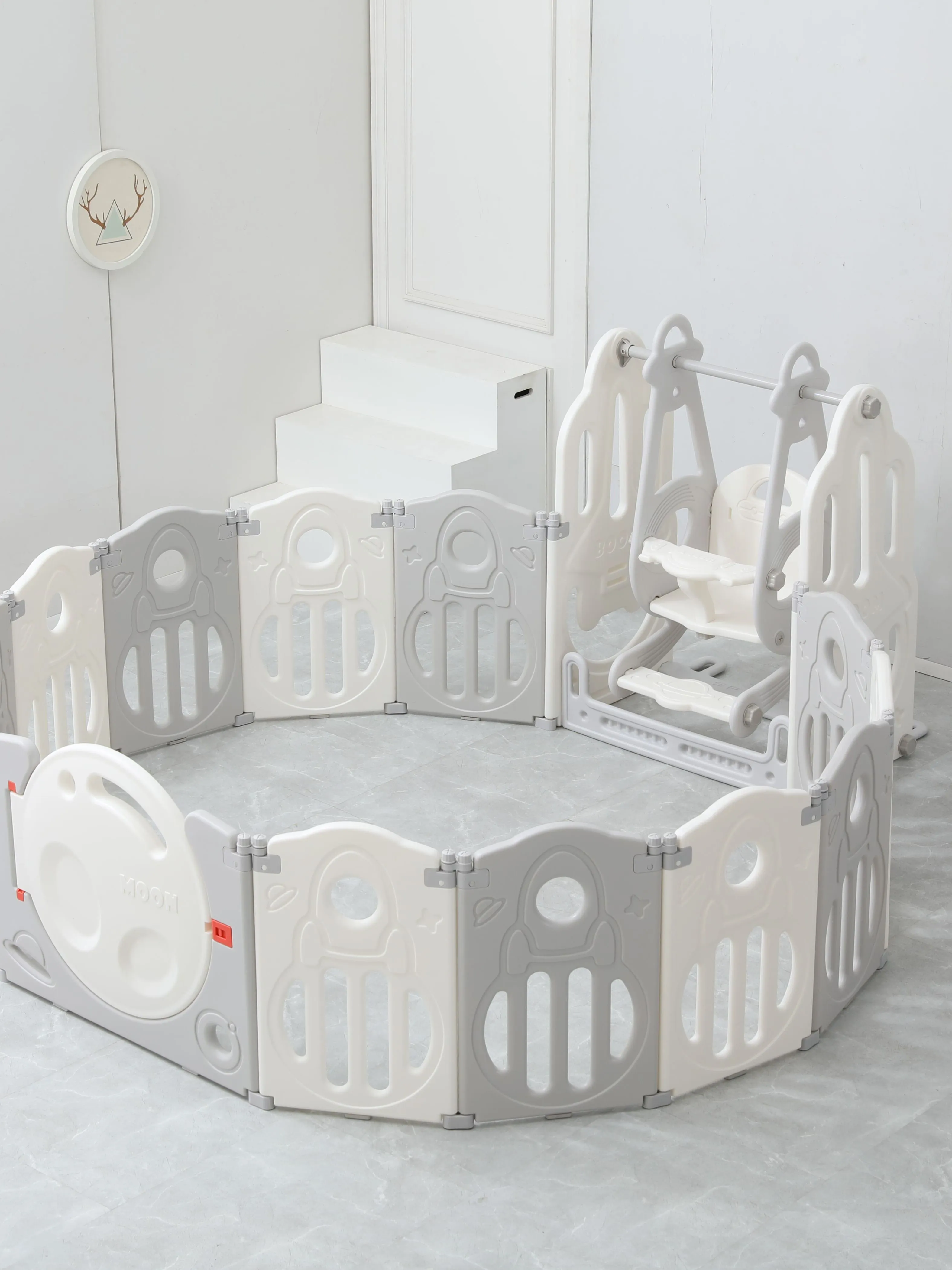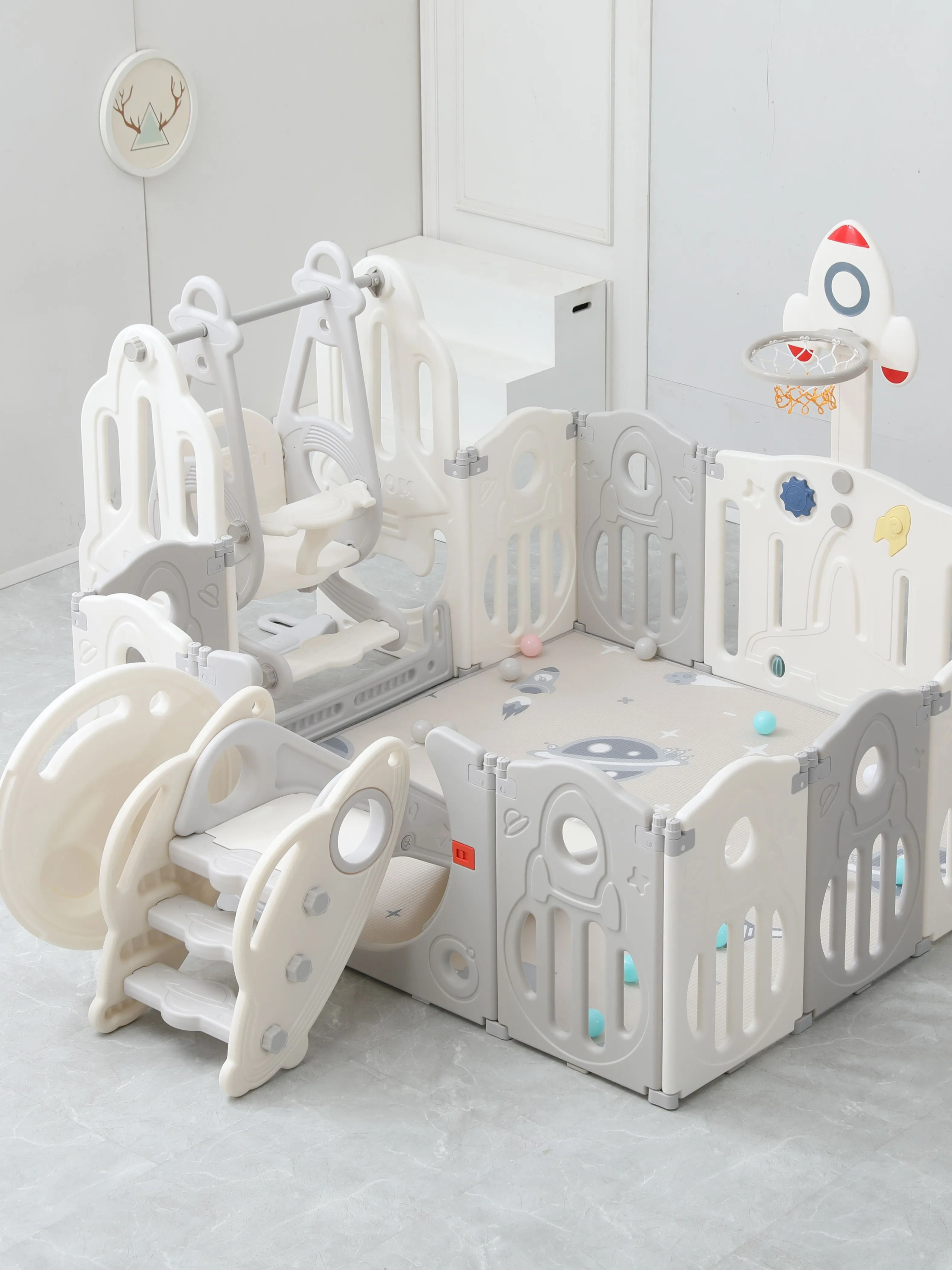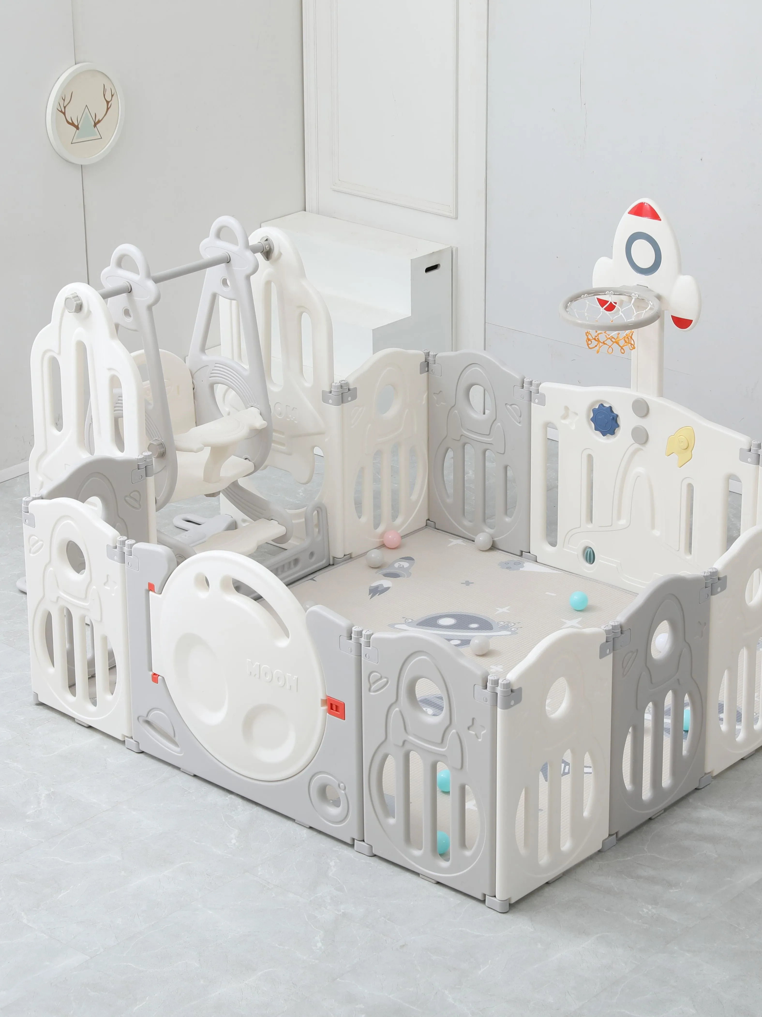 Игровые манежи для детей торговой марки UNIX Kids разработаны в Германии и изготовлены в соответствии с европейскими стандартами качества и безопасности. Материал, из которого состоят манежи, — пищевой пластик 4-го класса — согласно классификации ГОСТ, гипоаллергенный и абсолютно безвредный даже для самых маленьких пользователей. Так же этот материал не боится UV-лучей, и его можно использовать на улице. Все поверхности и высота манежа 63 см. спроектированы таким образом, чтобы максимально обезопасить ребенка от ушибов. Надежная конструкция, специальный фиксатор двери (входа в манеж), прочные соединители секций, противоскользящие опоры и специальные присоски создают идеальные условия для комфортного и безопасного времяпрепровождения юных исследователей мира. В комплекте со всеми моделями манежей UNIX Kids поставляется красочная игровая панель (бизиборд), хорошо развивающая мелкую моторику и умственные способности ребенка. Серия Supreme Space с качелями дополнительно укомплектована яркой баскетбольной стойкой с мячиком, горкой, которую вы можете разместить как в манеже, так и отдельно, и качелями, которые обязательно должны быть закреплены с манежем для безопасности вашего малыша. Так же в комплекте двусторонний полиуретановый коврик 160x160 см толщиной 10 мм и набор из 20 разноцветных шаров. Рифленая поверхность коврика не пропускает холод, смягчает падения при первых шагах и легка в уходе. Манеж легко хранить и перевозить, его сборка занимает 5-10 минут и не требует специальных инструментов. В зависимости от пространства вашей комнаты все манежи торговой марки UNIX Kids могут быть установлены в любой форме: прямоугольник, круг или буквой «Г». Внутренний размер манежа: 160х160 см. Приобретая игровой манеж UNIX Kids, вы создаете собственное уютное пространство для вашего малыша с заботой о его безопасности! Комплектация: Манеж, бизиборд, волнистая горка, качели, баскетбольная стойка, двусторонний полиуретановый коврик толщиной 10 мм и набор из 20 разноцветных шаров.