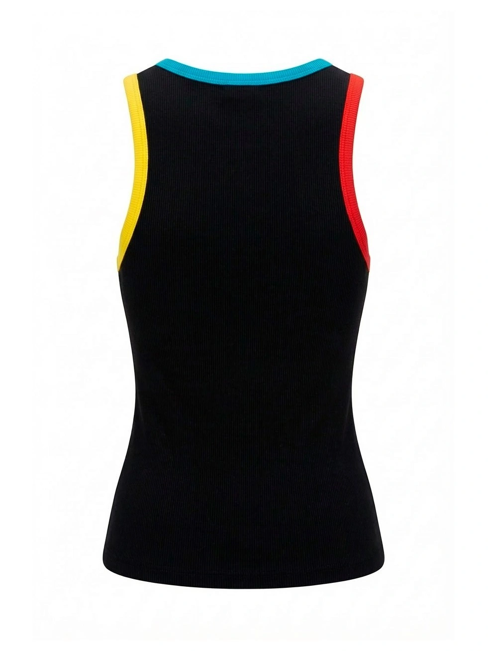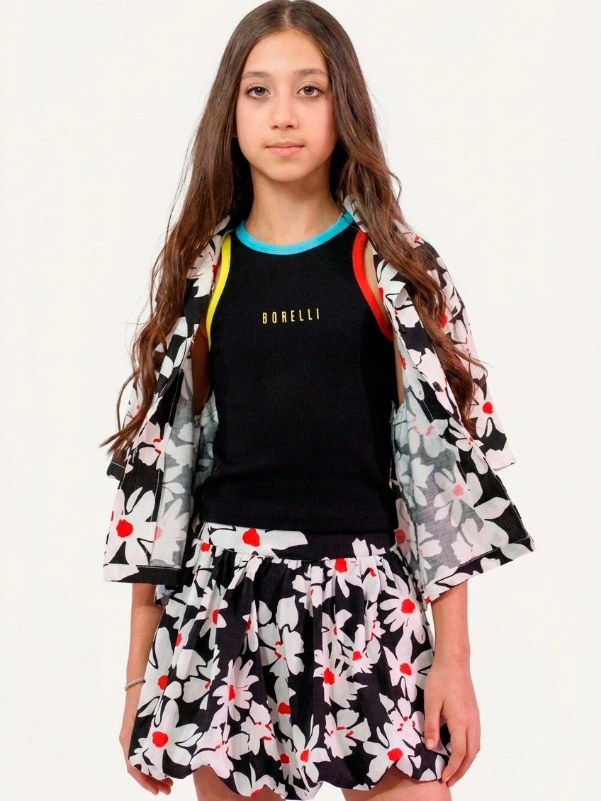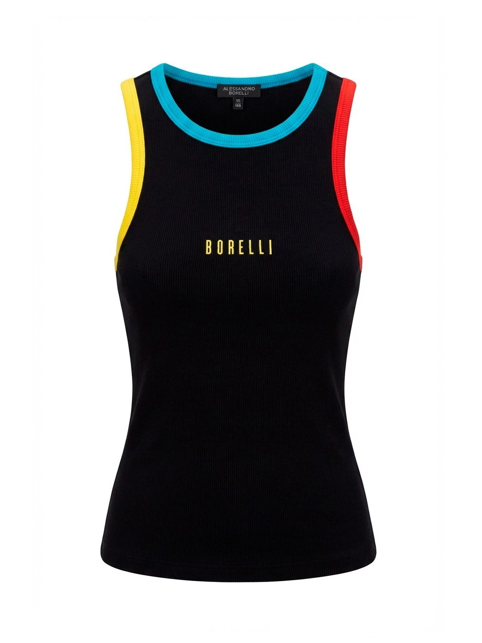 Черная майка в рубчик с цветными акцентами для девочек. Стильная облегающая майка черного цвета с круглым вырезом и яркими контрастными деталями. Эффектный дизайн с цветными акцентами: голубая окантовка горловины, желтая полоса на левом плече и красная на правом создают спортивный динамичный образ. На груди — небольшая золотистая надпись "BORELLI". Универсальная майка для спорта, танцев и повседневной носки. Отлично сочетается с джинсами, юбками, шортами и спортивными брюками. Эластичная хлопковая ткань обеспечивает комфортную посадку и свободу движений.