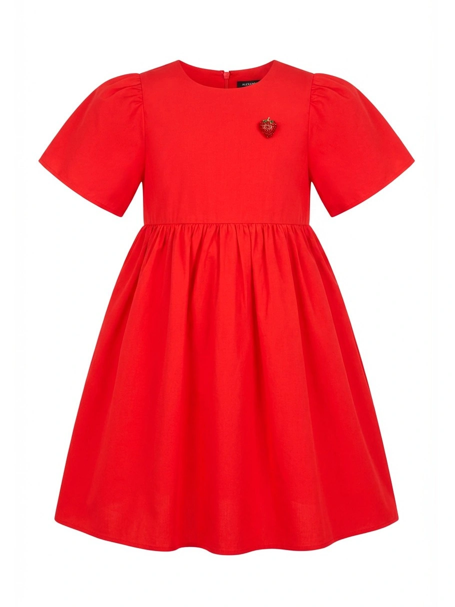 Красное платье для девочки с брошью. Нарядное красное платье для девочки с пышной юбкой и объёмными рукавами-фонариками. Приталенный силуэт, круглый вырез, застёжка на пуговицу сзади. Декоративная съемная брошь в виде клубники добавляет шарм и изюминку. Идеально для праздника, фотосессии и торжественных мероприятий. Купить нарядное детское платье красное с пышной юбкой — элегантный выбор для маленькой модницы.