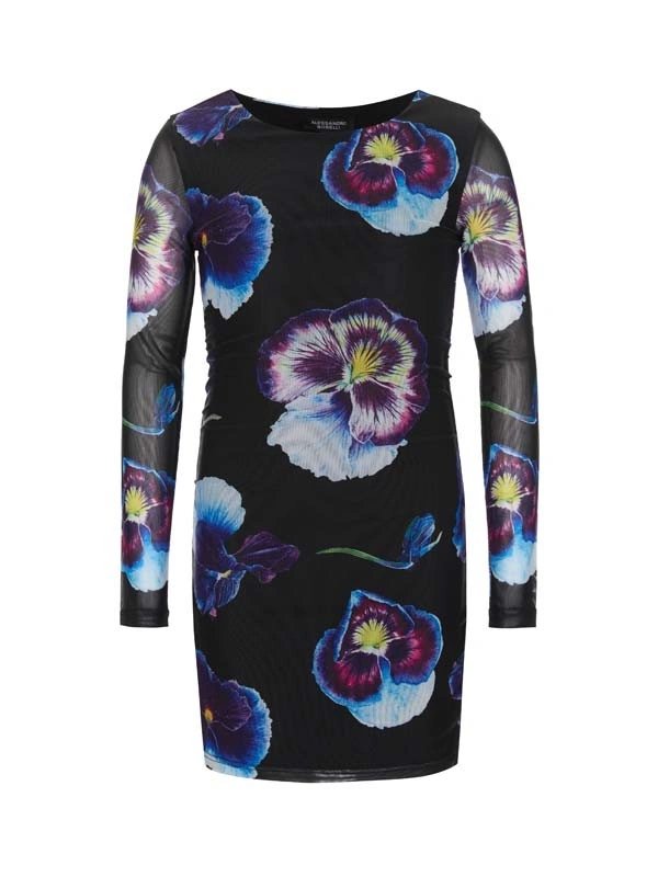 Платье ALESSANDRO BORELLI с длинным рукавом, длины миди из коллекции Violet выполнено из принтованной сетки с внутренней подкладкой. Основной цвет платья — черный, а его поверхность украшена ярким принтом крупных фиалок в оттенках синего, фиолетового и белого с желтыми акцентами в центре. Ткань не боится частых стирок и надолго сохранит яркость рисунка. Рукава выполнены из полупрозрачного материала, что придаёт наряду лёгкость и воздушность. Круглый вырез придает платью универсальность, оно подойдет для разных случаев — от вечернего выхода до стильного повседневного образа. Длина платья примерно до середины бедра, что подчеркивает его современный и женственный стиль.