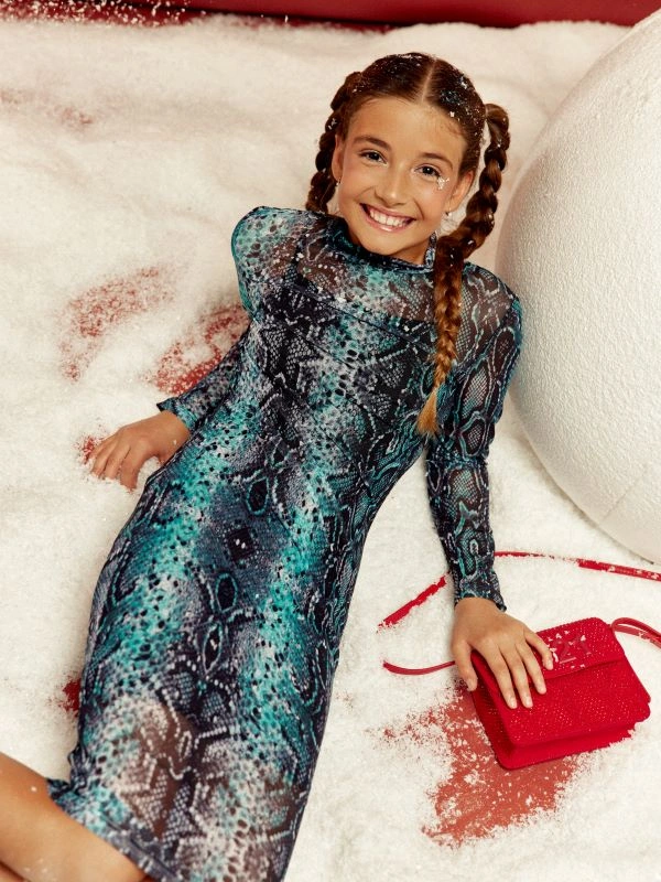 Платье ALESSANDRO BORELLI с длинным рукавом, длины миди из коллекции Snakes украшено эффектным змеиным принтом в бирюзовом цвете. Платье выполнено из принтованной сетки с внутренней подкладкой. Ткань не боится частых стирок и надолго сохранит яркость рисунка. Яркий и современный дизайн делает его подходящим для повседневной носки или вечерних мероприятий. Если хотите порадовать своего ребенка – подарите ему красивое платье ALESSANDRO BORELLI.