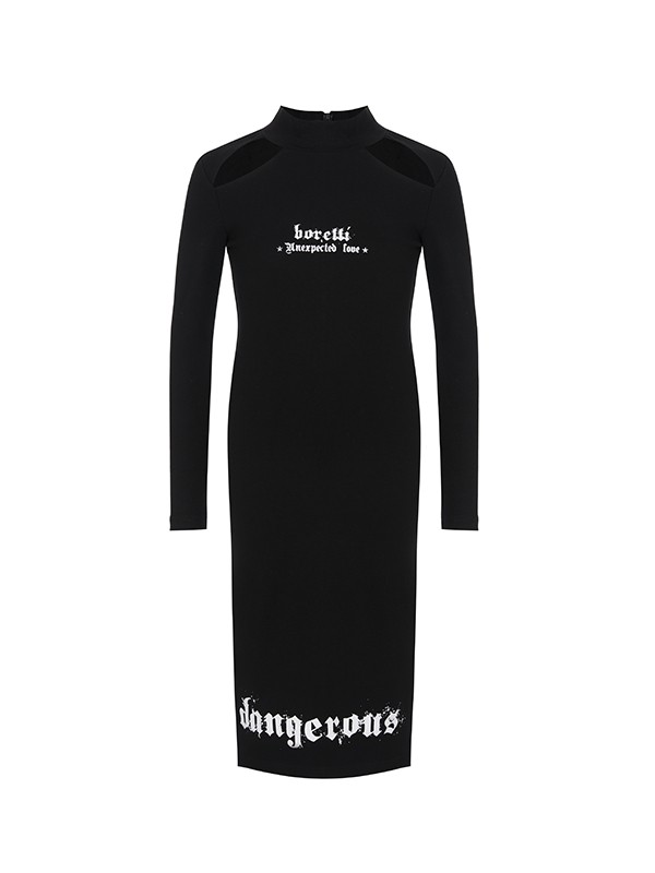 Платье ALESSANDRO BORELLI с длинными рукавами и высокой горловиной выполнено в черном цвете. Модель сочетает в себе комфорт и оригинальность, в стиле коллекции Snakes. Верхняя и нижняя части изделия украшены легким контрастным принтом в виде надписей. Облегающий силуэт придаёт наряду романтичность и легкость. Идеально подойдет как для повседневной носки, так и для особых случаев. Качественная ткань с большим добавлением района не боится частых стирок и надолго сохраняет яркость рисунка.