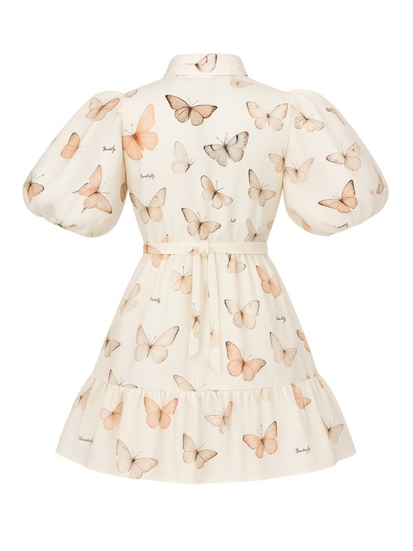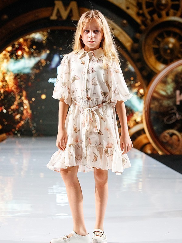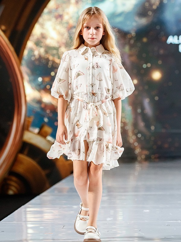 Очаровательное платье в молочном оттенке с изысканным принтом бабочек в пастельных тонах. Модель выполнена из лёгкой струящейся ткани, комфортной для тела. Пышные рукава добавляют объёма и делают силуэт более выразительным, а пояс на талии подчёркивает фигуру. Платье застёгивается на пуговицы по всей длине и дополнено оборкой по низу, создающей динамику и лёгкое движение при ходьбе. Идеально подходит для тёплого сезона, сочетаясь как с балетками или сандалиями, так и с лёгкими кедами.