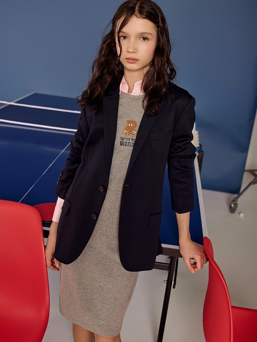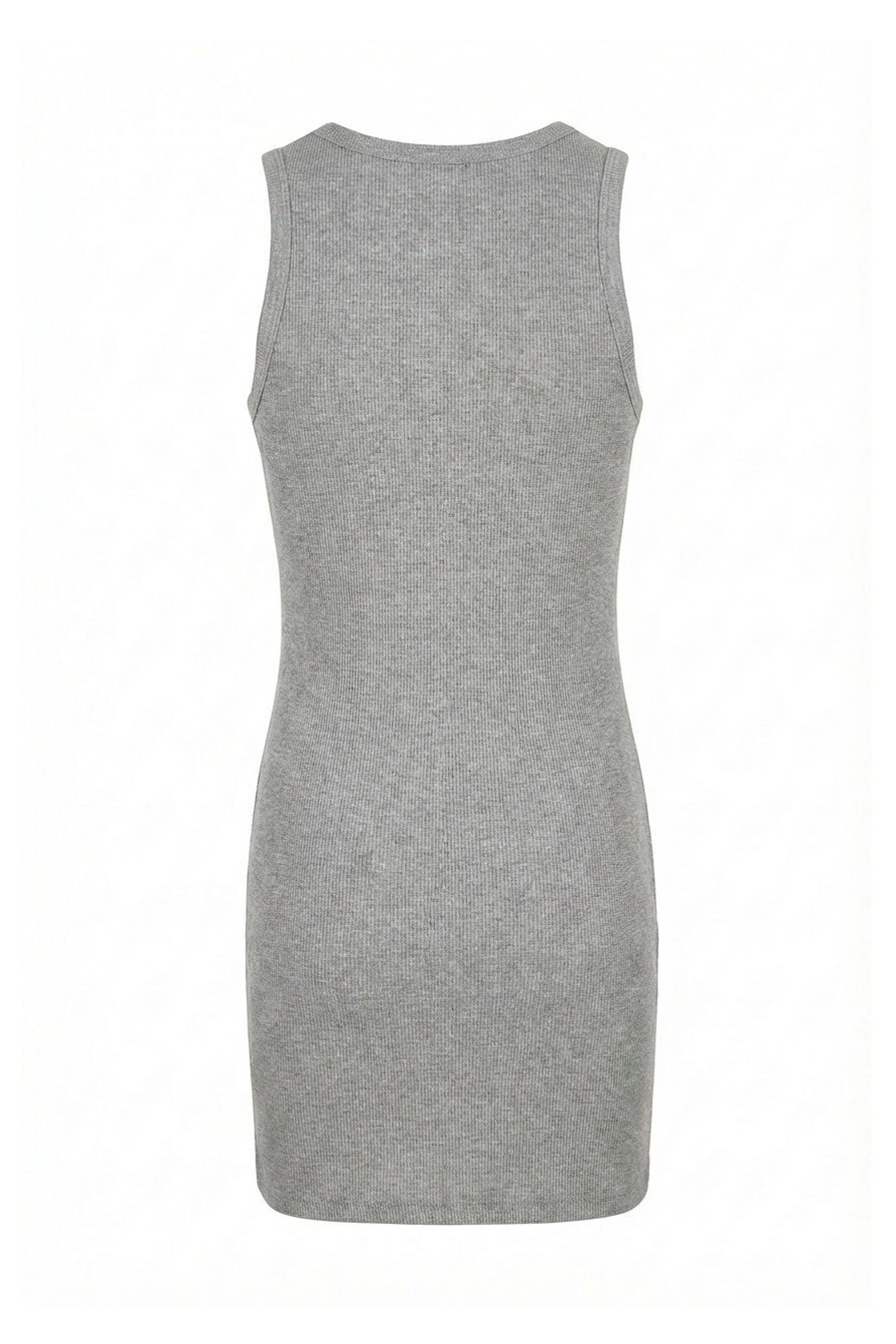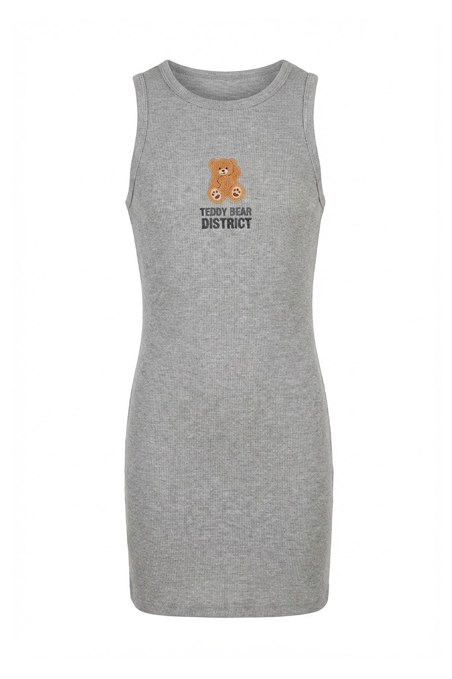 Серое платье-майка с мишкой для девочек. Комфортное платье серого меланжа выполнено из эластичного трикотажа в рубчик с круглым вырезом без рукавов. Минималистичный декор на груди: небольшая нашивка с изображением рыжего плюшевого мишки и надпись "TEDDY BEAR DISTRICT" черными буквами создают уютный детский образ. Облегающий крой подчеркивает силуэт. Универсальное платье для повседневной носки. Отлично сочетается с кроссовками, кедами и сандалиями. Эластичная ткань обеспечивает комфортную посадку и свободу движений.