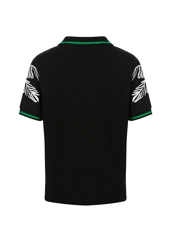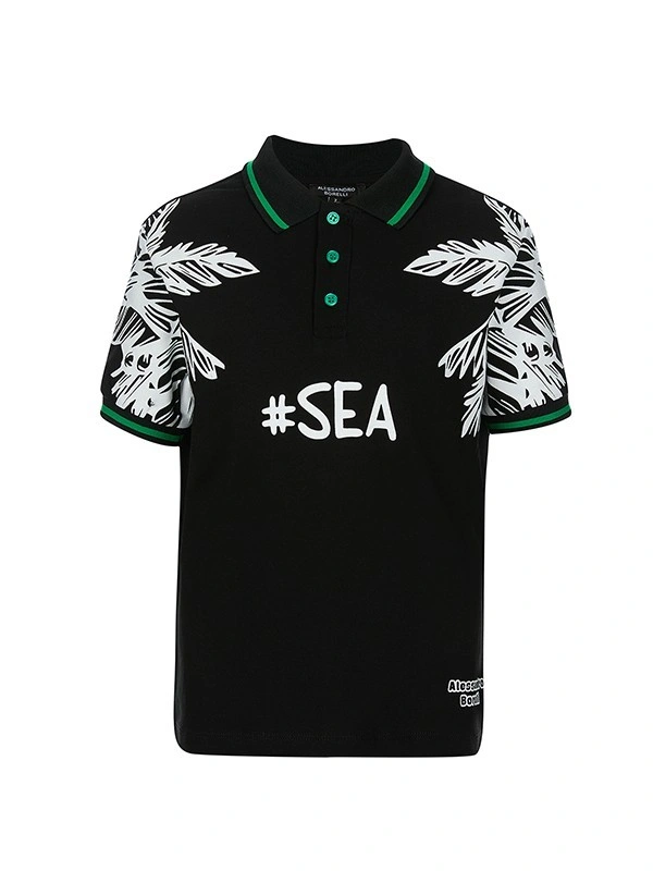 Футболка-поло ALESSANDRO BORELLI для мальчика – лучший выбор для лета и теплой весны. Модель украшена яркими белыми принтами в виде тропических листьев на плечах и рукавах, создающими летнее настроение. На груди размещена надпись "#SEA", подчёркивающая морскую тематику и подходящая для отдыха. Застёжка на три пуговицы, воротник и манжеты украшены зелёными и чёрными полосками, придающими контрастный акцент. Модель выполнена из качественной хлопковой ткани, которая долго сохраняет свою яркость и не выцветает после стирки. Футболка будет хороша для прогулок, отдыха или занятий спортом. Прекрасно сочетается как с любой одеждой из коллекции Tropical, так и с другими моделями.
