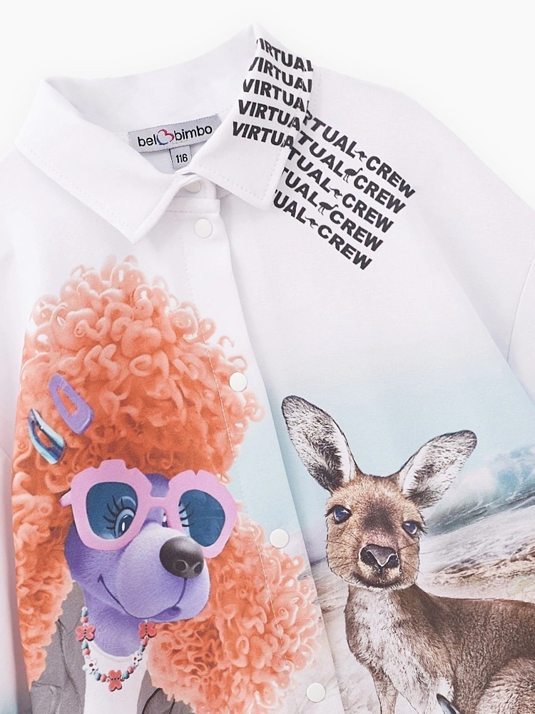 Авторский жакет-рубашка для девочки. Прямая модель. Спущенная линия плеча. Эластичные манжеты. Комфортная застёжка на кнопки. Рубашка декорирована дизайнерскими принтами и плёнкой с мерцающим эффектом.