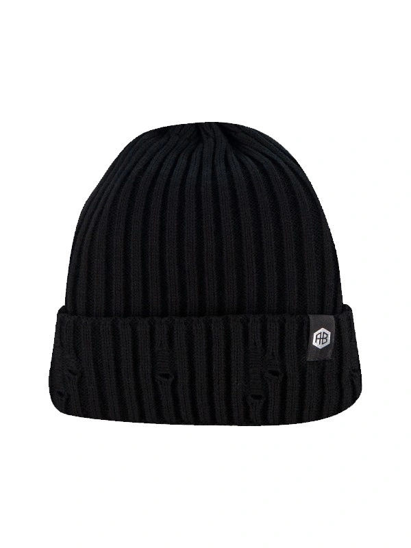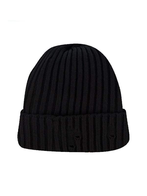 Вязаная шапка выполнена из мягкой, приятной на ощупь пряжи черного цвета. Она имеет классический фасон с отворотом, который можно регулировать по желанию. Шапка украшена рваным эффектом и небольшой нашивкой сбоку, которая придаёт шапке завершённый вид. Данная модель - универсальный аксессуар, который легко сочетается с различными образами, а также обеспечит комфорт и защиту от ветра. Подойдет для повседневных прогулок или зимних игр.