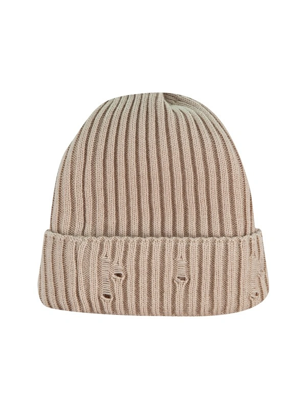 Вязаная шапка выполнена из мягкой, приятной на ощупь пряжи бежевого цвета. Она имеет классический фасон с отворотом, который можно регулировать по желанию. Шапка украшена рваным эффектом и небольшой нашивкой сбоку, которая придаёт шапке завершённый вид. Данная модель - универсальный аксессуар, который легко сочетается с различными образами, а также обеспечит комфорт и защиту от ветра. Подойдет для повседневных прогулок или зимних игр.