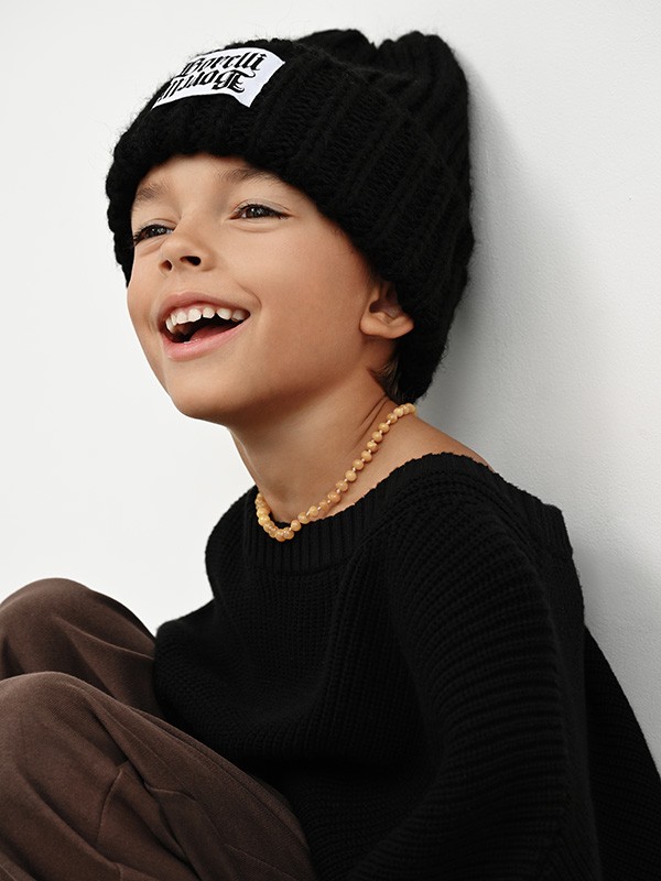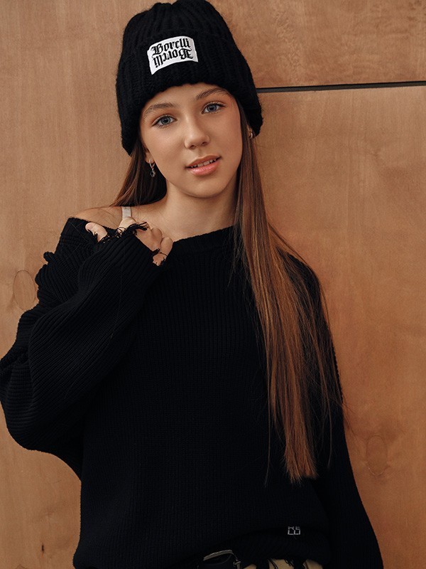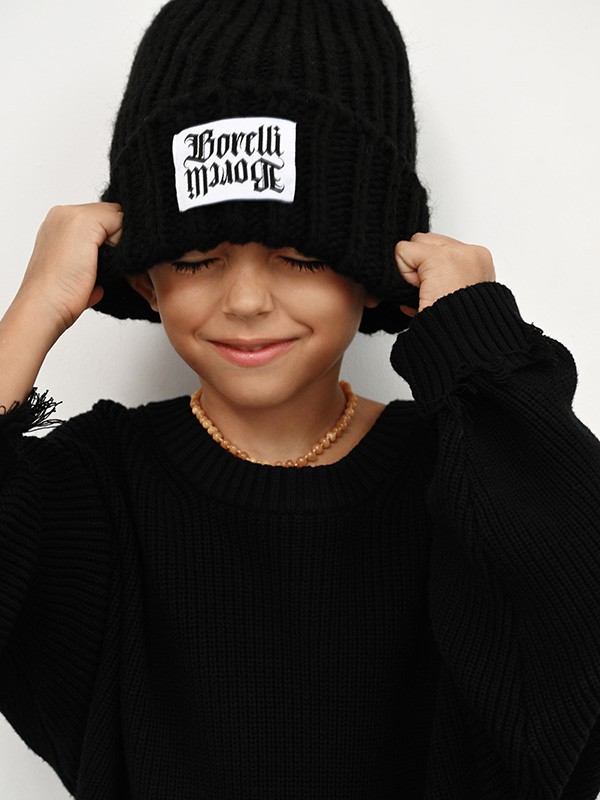 Вязаная шапка выполнена из мягкой, приятной на ощупь пряжи черного цвета. Она имеет классический фасон с отворотом, на котором присутствует контрастная черно-белая нашивка с надписью. Универсальный дизайн подчеркнет любой образ, добавив уют и тепло в холодное время года. А также обеспечит комфорт и защиту от ветра. Этот аксессуар подойдет для повседневных прогулок или зимних игр.