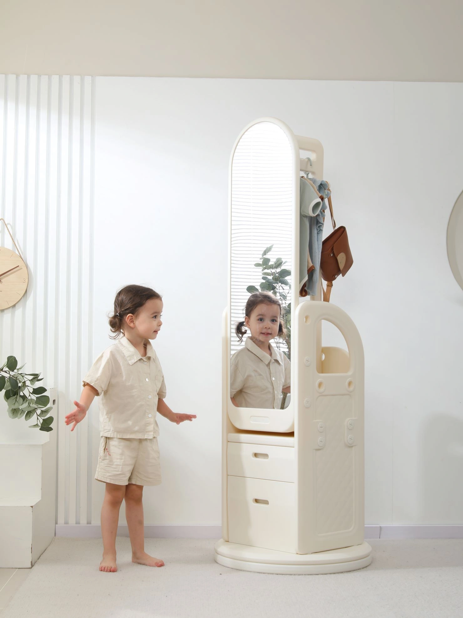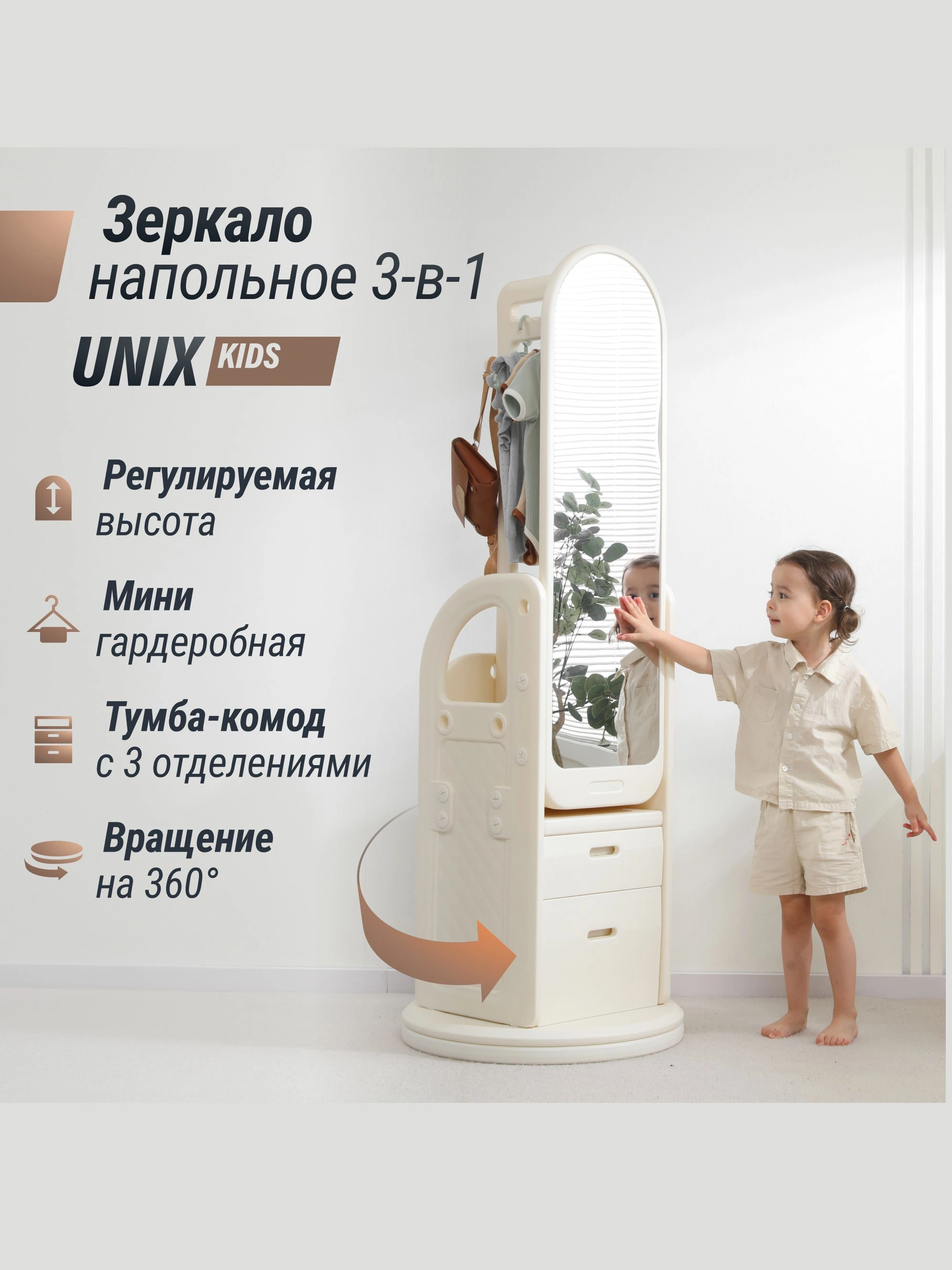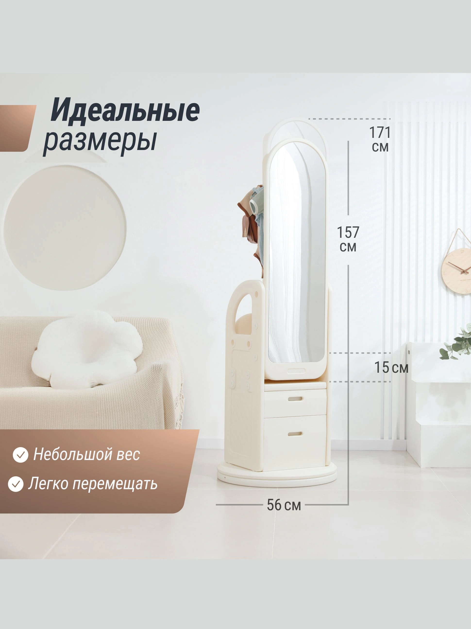 Габариты изделия в собранном виде, см - 56 х 56 х 157-171. Габариты упаковки, см - 137 х 24 х 38 ; 56 х 7 х 56. Напольное зеркало с системой хранения UNIX Kids Classic White станет не только функциональным элементом интерьера, но и настоящим украшением детской комнаты! Комод с зеркалом оснащен вешалкой, что позволяет ребенку удобно развешивать одежду, сумки или аксессуары. Маленькие модницы и модники смогут самостоятельно поддерживать порядок в своей комнате, выбирать наряды и организовывать свое богатство! Ребенок сможет учиться одеваться самостоятельно, примерять новые образы и развивать чувство стиля! Под зеркалом расположены ящики, которые идеально подойдут для хранения одежды, игрушек или других мелочей. С обратной стороны зеркала находится штанга и вешалка для одежды или сумки. За зеркалом расположено скрытое отделение для хранения украшений и других аксессуаров. Тумба органайзер вращается на 360 градусов, что позволяет использовать мини гардеробную с максимальным комфортом. С помощью системы хранения ребенок научится систематизировать свои вещи, что поможет ему в будущем. Детская мебель выполнена из гипоаллергенного пищевого пластика с закругленными углами. Зеркало из акрила исключает риск травм, оно устойчиво к ударам и царапинам, что делает его идеальным для активных малышей! Зеркало легко собирается, а уход за ним не составит труда — достаточно протереть поверхность мягкой тканью для поддержания чистоты.