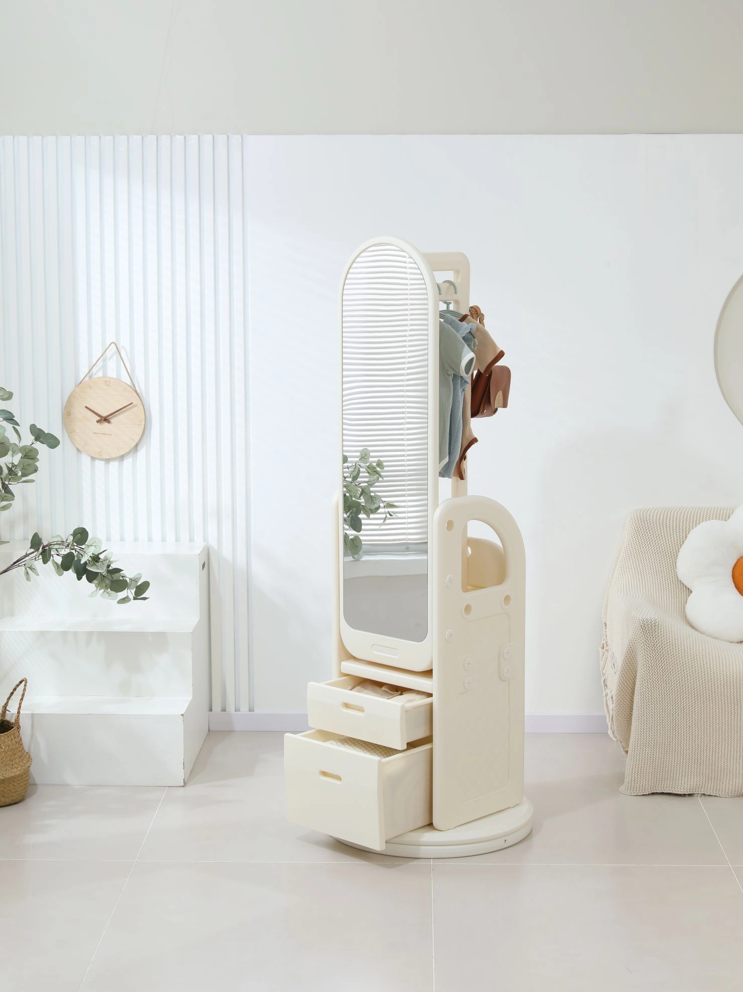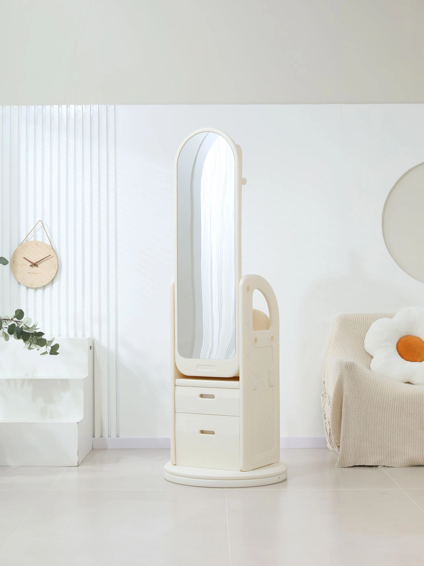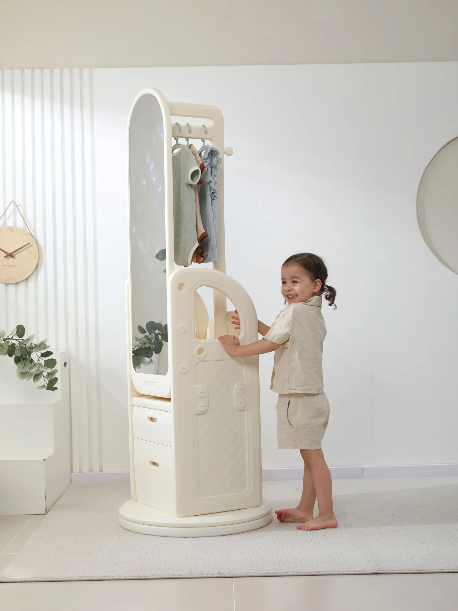 Габариты изделия в собранном виде, см - 56 х 56 х 157-171. Габариты упаковки, см - 137 х 24 х 38 ; 56 х 7 х 56. Напольное зеркало с системой хранения UNIX Kids Classic White станет не только функциональным элементом интерьера, но и настоящим украшением детской комнаты! Комод с зеркалом оснащен вешалкой, что позволяет ребенку удобно развешивать одежду, сумки или аксессуары. Маленькие модницы и модники смогут самостоятельно поддерживать порядок в своей комнате, выбирать наряды и организовывать свое богатство! Ребенок сможет учиться одеваться самостоятельно, примерять новые образы и развивать чувство стиля! Под зеркалом расположены ящики, которые идеально подойдут для хранения одежды, игрушек или других мелочей. С обратной стороны зеркала находится штанга и вешалка для одежды или сумки. За зеркалом расположено скрытое отделение для хранения украшений и других аксессуаров. Тумба органайзер вращается на 360 градусов, что позволяет использовать мини гардеробную с максимальным комфортом. С помощью системы хранения ребенок научится систематизировать свои вещи, что поможет ему в будущем. Детская мебель выполнена из гипоаллергенного пищевого пластика с закругленными углами. Зеркало из акрила исключает риск травм, оно устойчиво к ударам и царапинам, что делает его идеальным для активных малышей! Зеркало легко собирается, а уход за ним не составит труда — достаточно протереть поверхность мягкой тканью для поддержания чистоты.