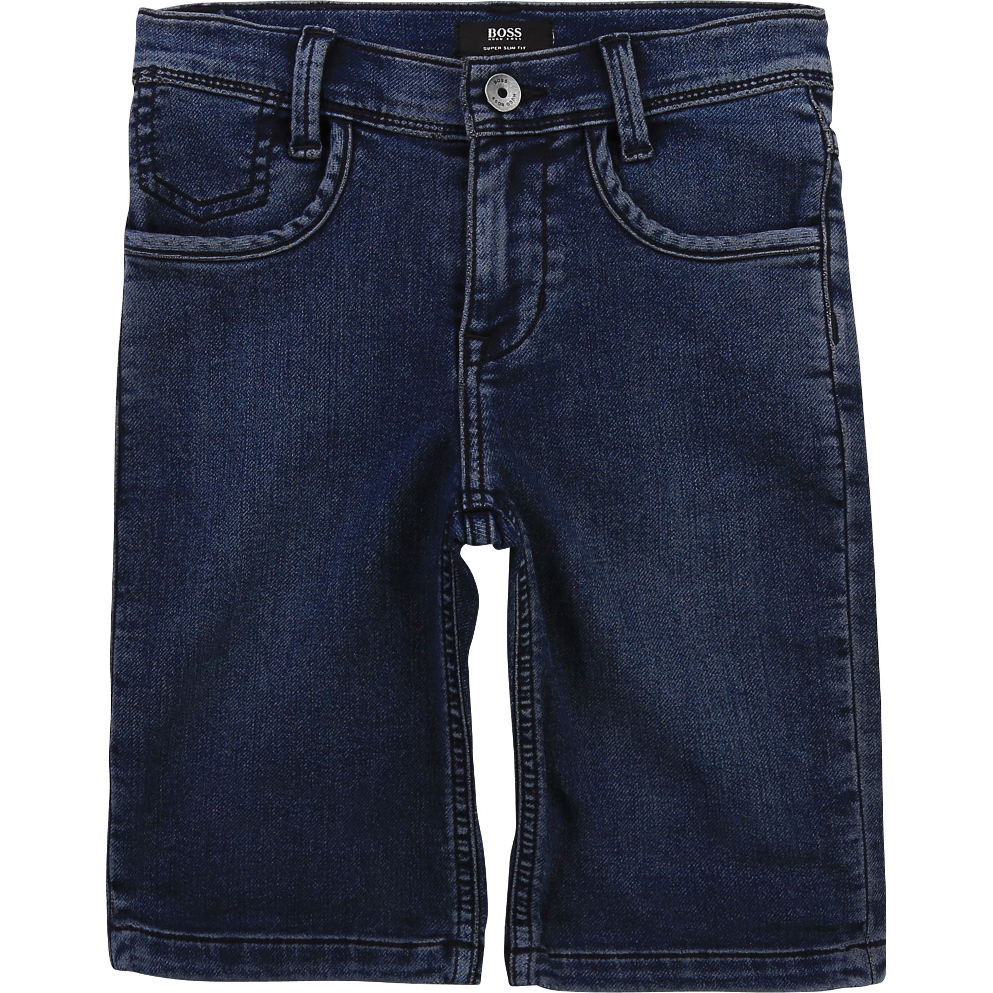 Застежка на молнии и пуговице спереди, классическая пятикарманная модель и эффект потертости.