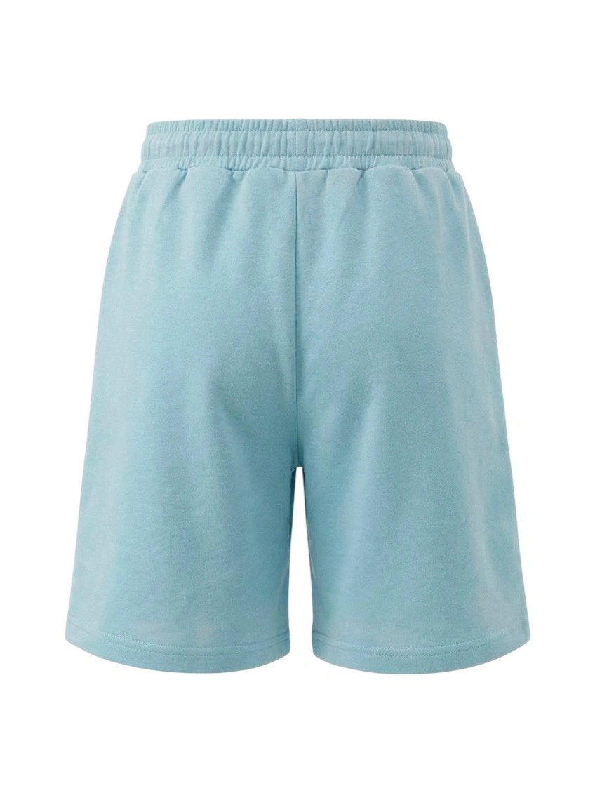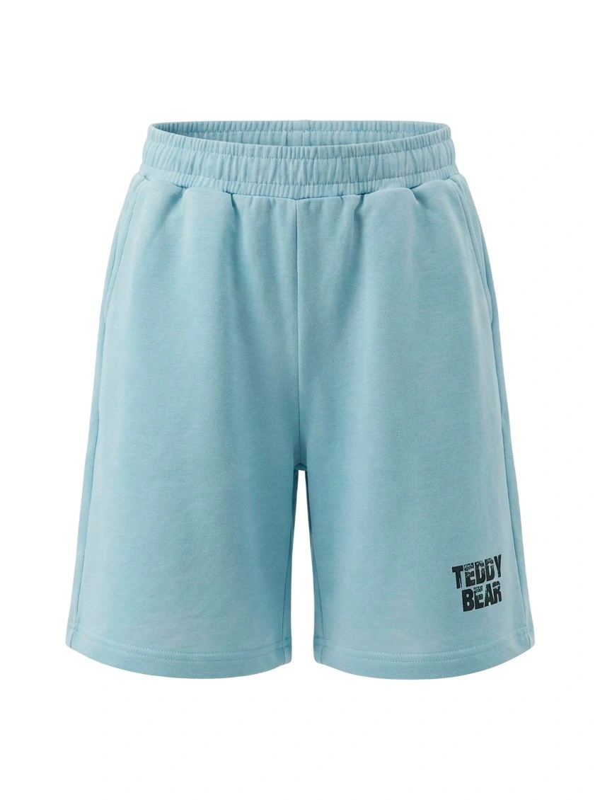 Спортивные шорты Teddy для девочек. Комфортные спортивные шорты светло-голубого цвета выполнены из мягкого трикотажа с эластичным поясом на резинке для комфортной посадки. Свободный крой средней длины обеспечивает комфорт при движении. Справа внизу — черная надпись "TEDDY BEAR" с эффектом потертости. Практичные боковые карманы для мелочей. Универсальные шорты для спорта, прогулок и повседневной носки отлично сочетаются с футболками, топами и свитшотами.