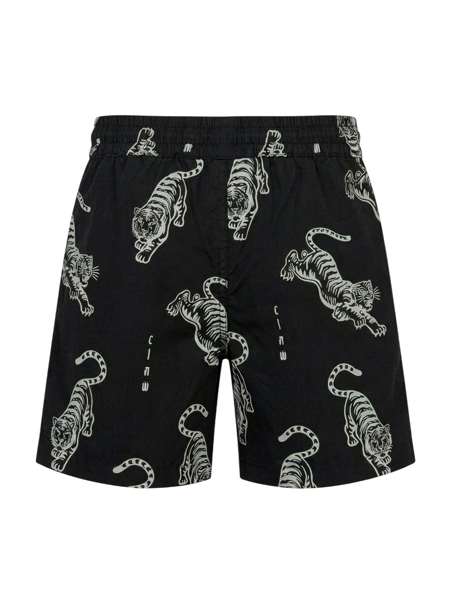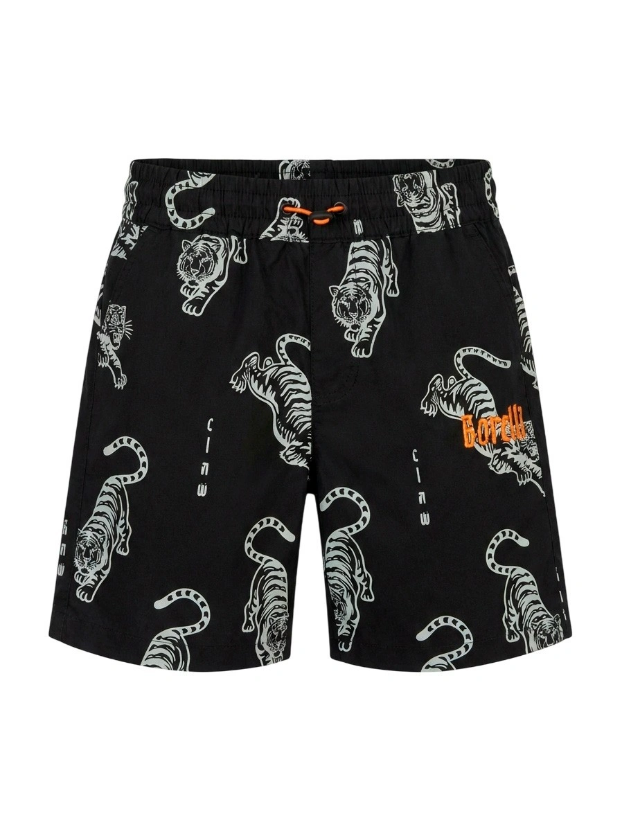 Черные шорты Borelli с белыми тиграми для мальчиков. Яркие спортивные шорты черного цвета с эффектным графичным дизайном выполнены из качественного трикотажа с эластичным поясом на резинке и оранжевыми шнурками для регулировки посадки. Контрастный принт с белыми изображениями прыгающих тигров по всей поверхности создает динамичный уличный образ. Справа — оранжевая надпись "Borelli" в готическом стиле. Свободный крой средней длины обеспечивает комфорт при движении. Универсальные шорты отлично сочетаются с футболками и майками.