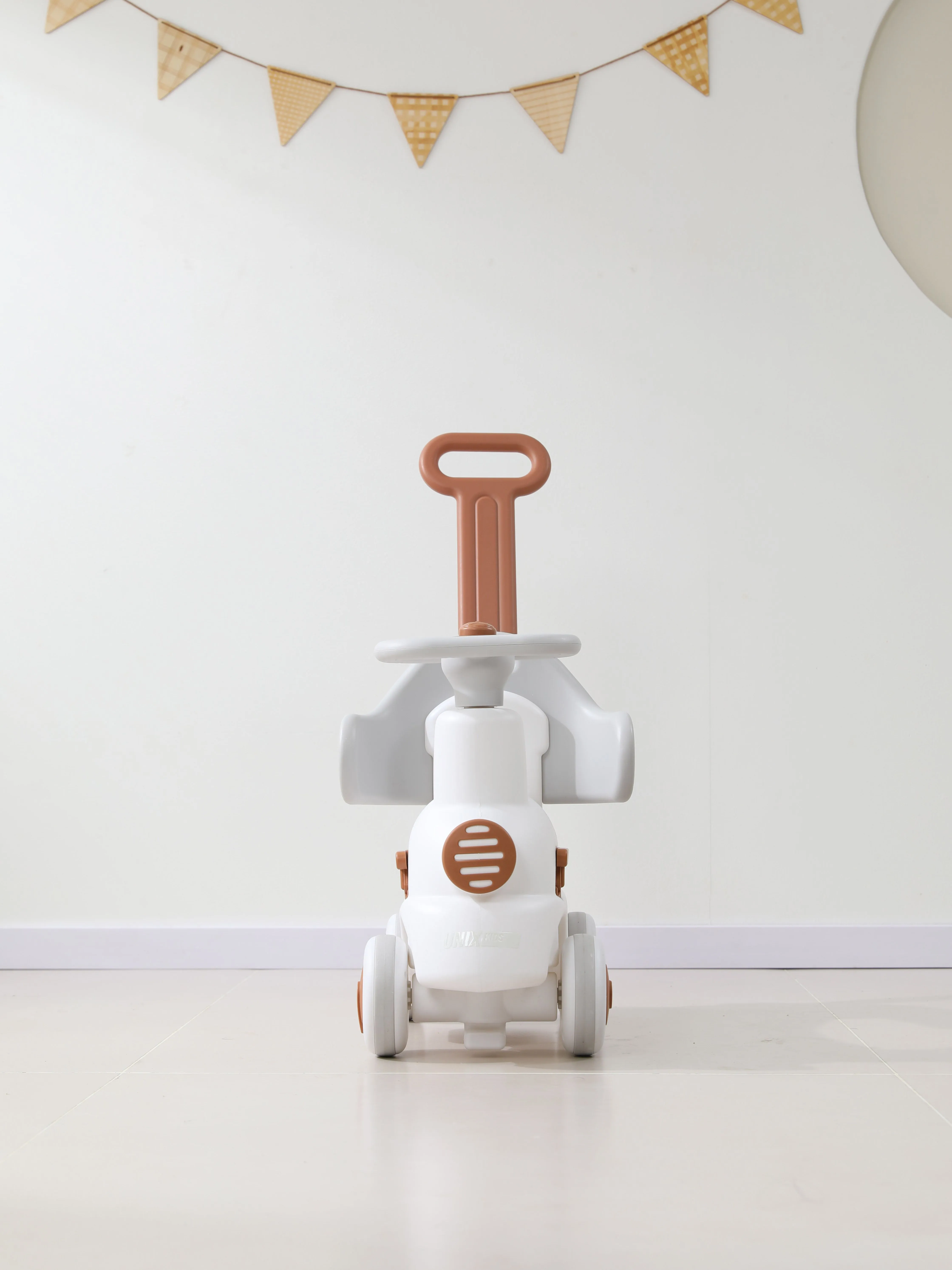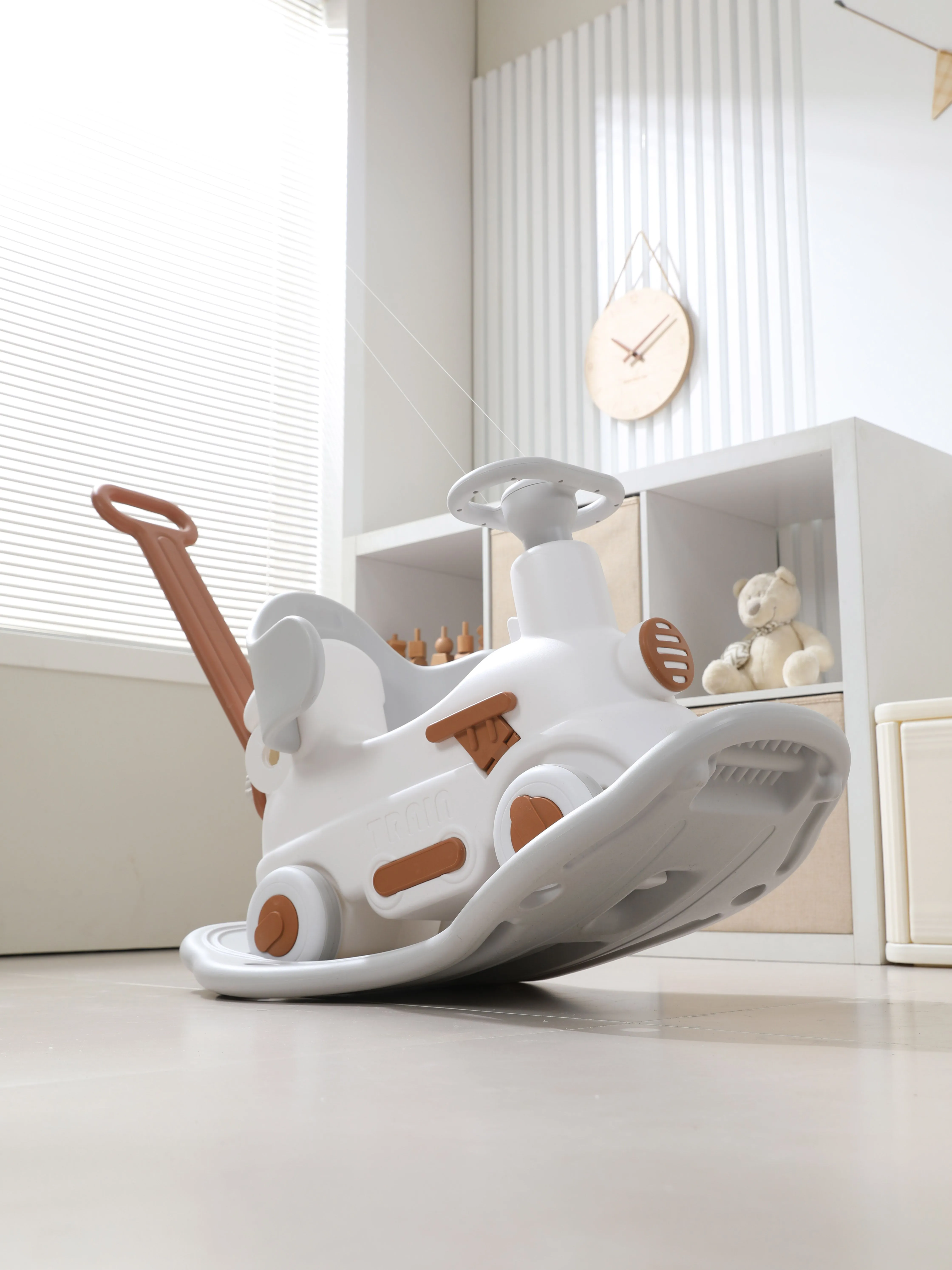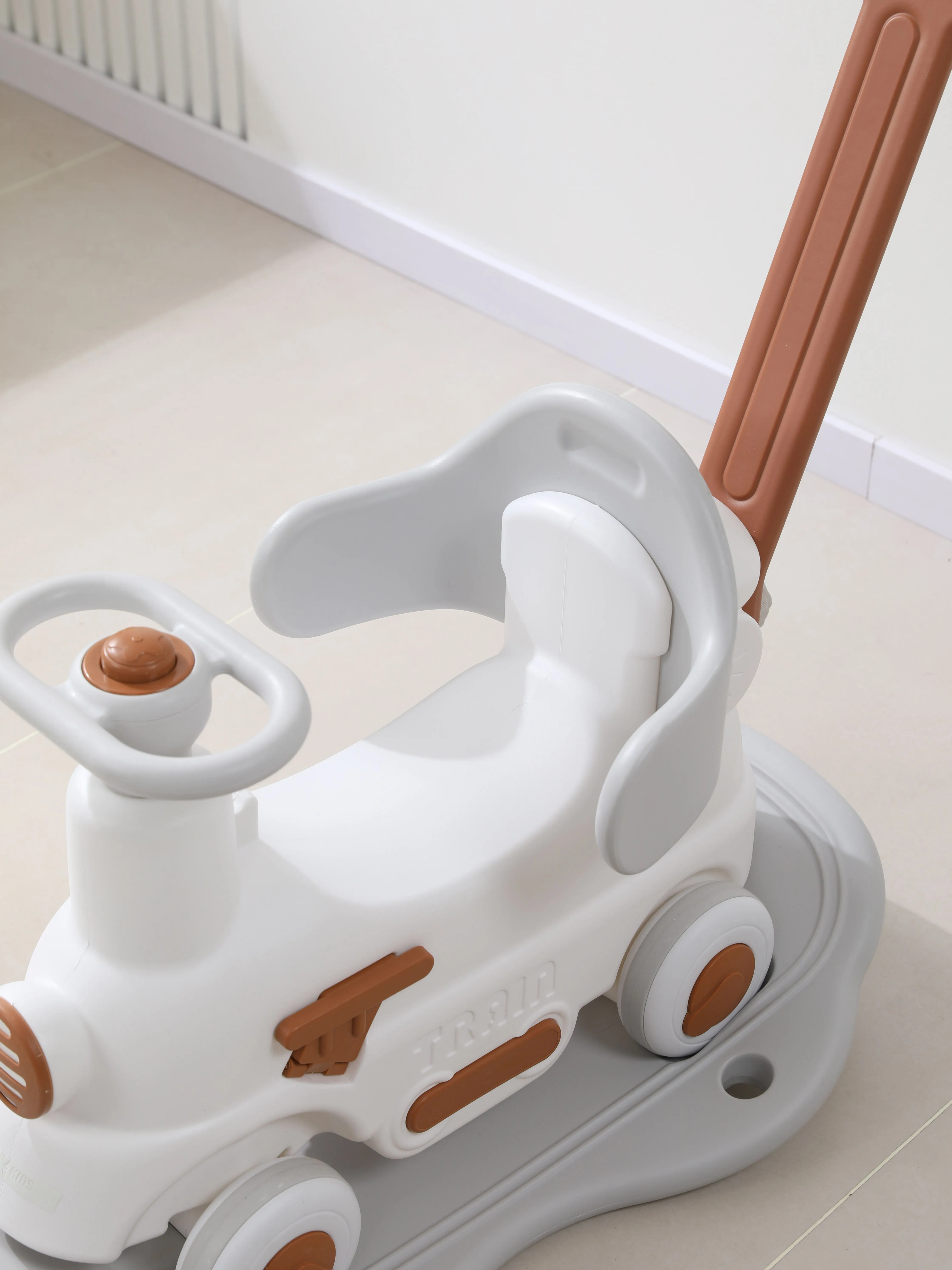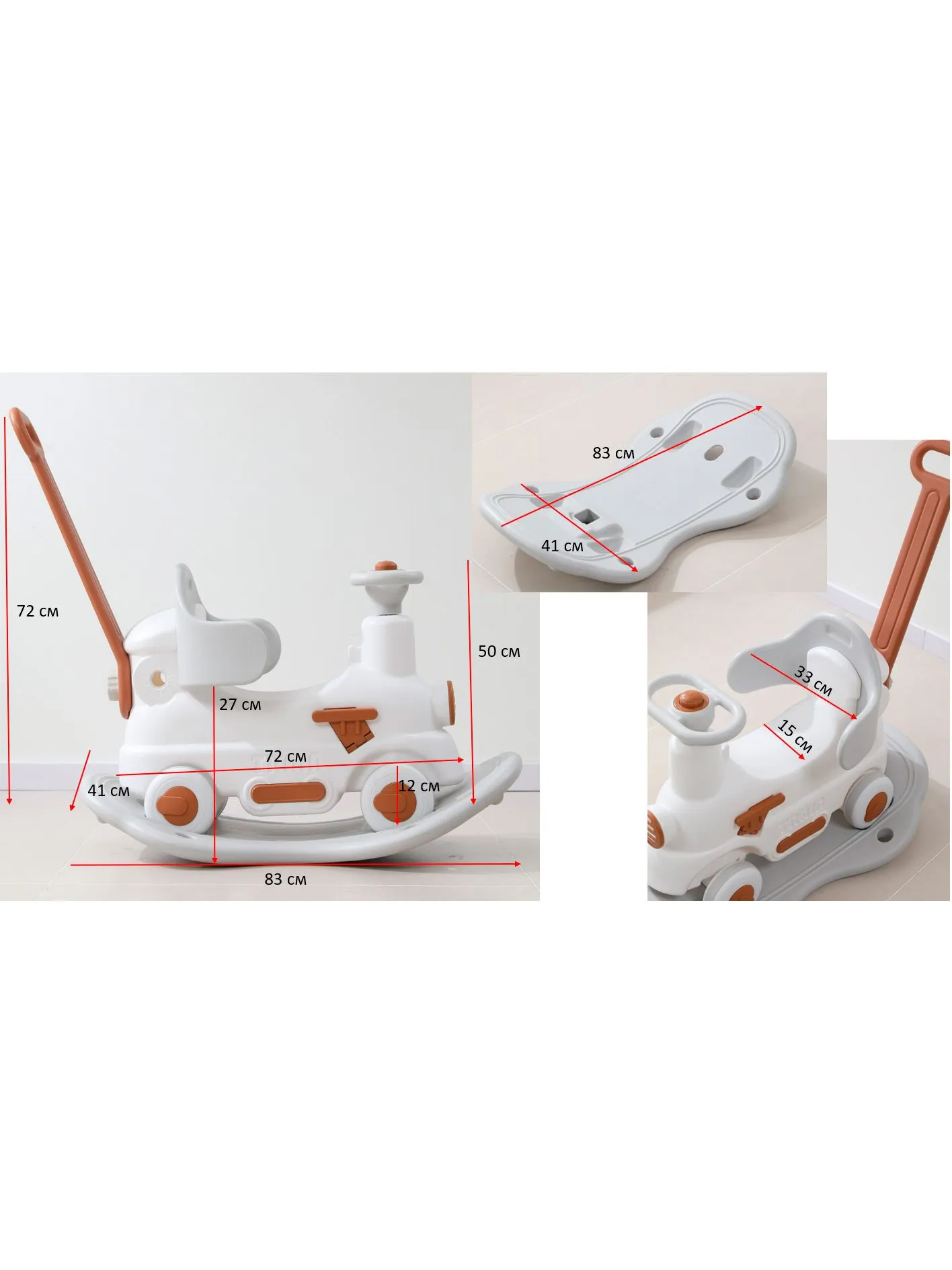 Качалка-каталка UNIX Kids Train Grey в виде поезда - это уникальная развивающая игрушка, которая сочетает в себе три функции в одной – качалка, беговел, балансборд, что позволит ребенку наслаждаться игрой на разных этапах развития. Ни один малыш не останется равнодушным к такой игрушке. Благодаря лаконичному дизайну качалка-каталка прекрасно впишется в любой интерьер. Ребенок разовьет сообразительность, координацию движений, ловкость и чувство равновесия. Качалка-беговел поможет укрепить мышцы ножек, спины и живота ребенка. Многофункциональная игрушка станет прекрасным помощником для родителей, ведь ребенок будет учиться играя, находясь в абсолютной безопасности. Качалкой можно начать пользоваться уже с 6 месяцев. Ребенок сможет качаться вперед и назад, получая настоящее удовольствие от игры. Конструкция качалки детально продумана, чтобы обеспечить полную безопасность, а родители были абсолютно спокойны! С 12 месяцев малыш сможет раскачиваться взад-вперед, как на качалке, а с 18 месяцев игрушка с легкостью превращается в каталку-беговел для дома и улицы, помогая развивать навыки ходьбы. Беговел можно использовать, как балансборд для развития координации и ловкости движений. Используя игрушку, как балансборд можно не переживать за ребенка, так как сохраняется угол подъема в 40 градусов, а широкое устойчивое основание делает раскачивания абсолютно безопасными. Вся конструкция игрушки - трансформера продумана до мелочей. Благодаря поворотному рулю с музыкальной кнопкой ребенку будет сам управлять транспортом. Каталка очень маневренная, но при этом абсолютна безопасна для маленьких непосед. Бесшумные прорезиненные колеса не только защищают напольное покрытие, но и делают движения беговела плавными и беззвучными и при прогулках преодолевают даже неровности на дороге. Как и вся продукция UNIX Kids, поезд-беговел-балансборд изготовлен из пищевого пластика и имеет сертификацию. Пищевой пластик гипоаллергенен, не имеет запаха и абсолютно безопасен для маленьких пользователей. Он не подвержен UV-излучению, поэтому каталка не выгорит на солнце и не потеряет свой цвет. Беговел прекрасно моется, поэтому подходит для использования, как дома, так и на улице. Сглаженные углы игрушки выполнены с большим вниманием, чтобы малыш мог комфортно и безопасно пользоваться игрушкой.