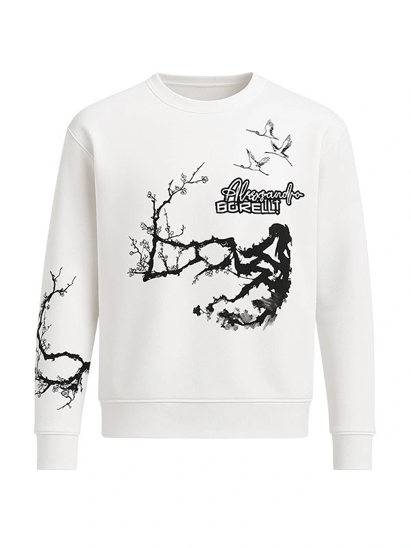 Свитшот для девочки Alessandro Borelli — стильная модель с утончённым художественным дизайном, вдохновлённым природными мотивами. Выполнен из качественного хлопкового материала, который приятен к телу и идеально подходит для активного дня. На передней части — изящный чёрно-белый принт с изображением ветвей сакуры, летящих птиц и фирменной надписью Alessandro Borelli, создающий ощущение лёгкости и гармонии. Манжеты, ворот и низ изделия оформлены эластичной резинкой для комфортной посадки.