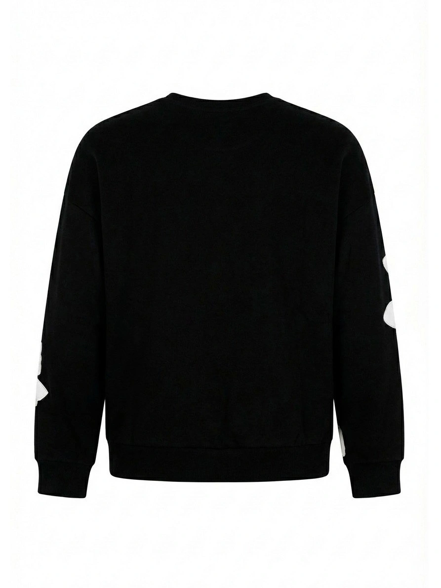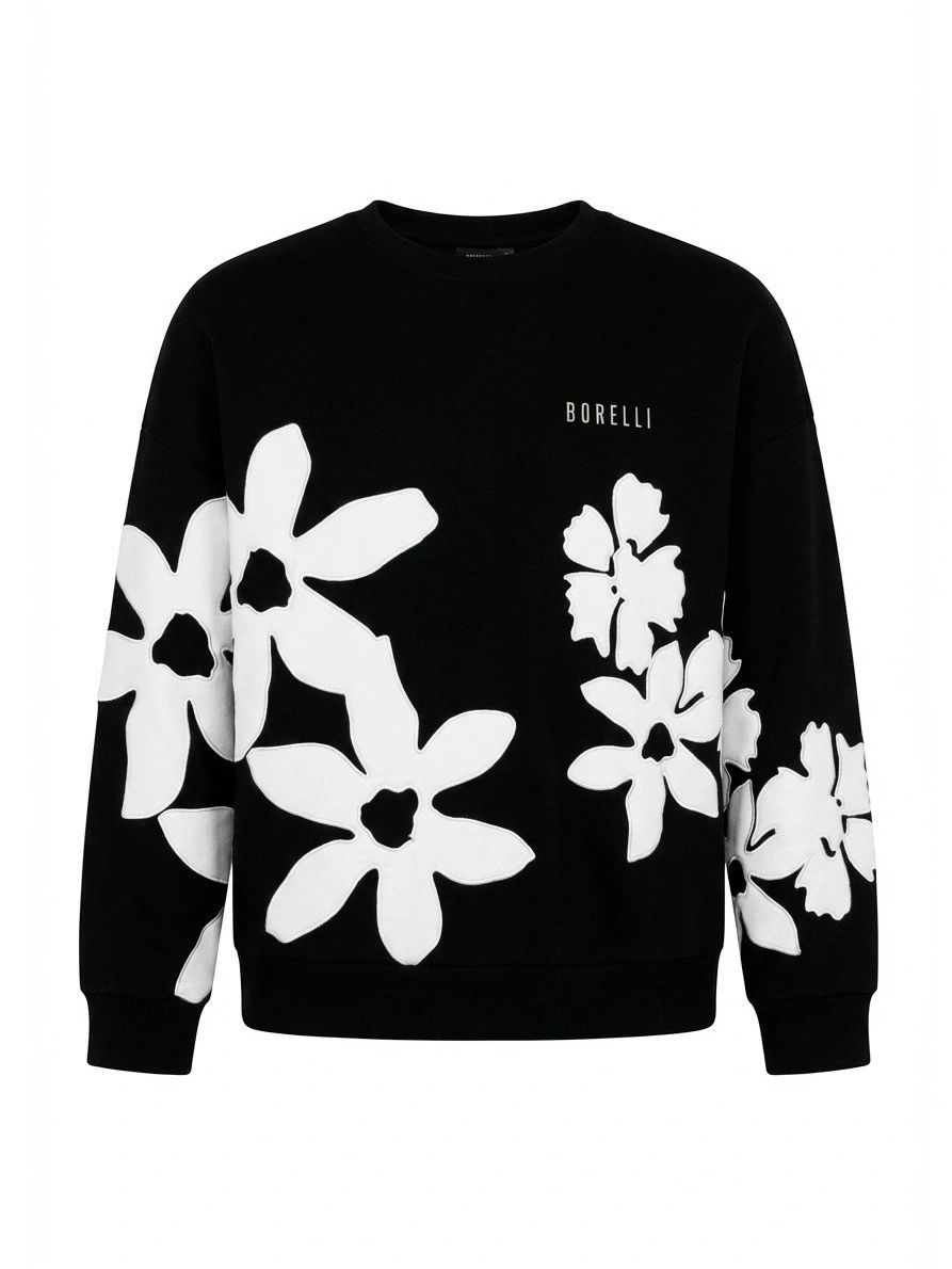 Черный свитшот с белыми цветами для девочек. Стильный свитшот черного цвета выполнен из мягкого трикотажа с круглым вырезом, длинными рукавами, эластичными манжетами и резинкой по низу. Крупный контрастный принт с белыми графичными цветами на левом боку и правом рукаве создает асимметричную композицию. Справа вверху — небольшая белая надпись "BORELLI". Минималистичный черно-белый дизайн выглядит современно и стильно. Универсальный свитшот для повседневной носки. Отлично сочетается с джинсами, юбками и брюками. Качественный материал обеспечивает комфорт и тепло.