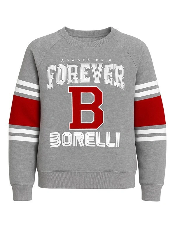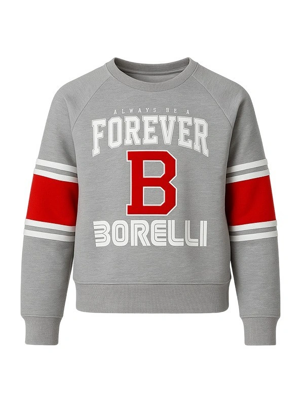 Свитшот для девочки Alessandro Borelli выполнен в стиле американского колледжа и сочетает комфорт с трендовым дизайном. Модель из качественной хлопковой ткани с начесом приятна к телу и обеспечивает свободу движений, а эластичные манжеты и низ изделия сохраняют форму при носке. Серый цвет гармонично дополнен контрастными красными и белыми полосами на рукавах, создающими эффект спортивной динамики. Спереди расположен крупный принт с буквой B и надписью Forever Borelli, подчёркивающий фирменный стиль бренда.