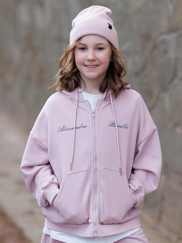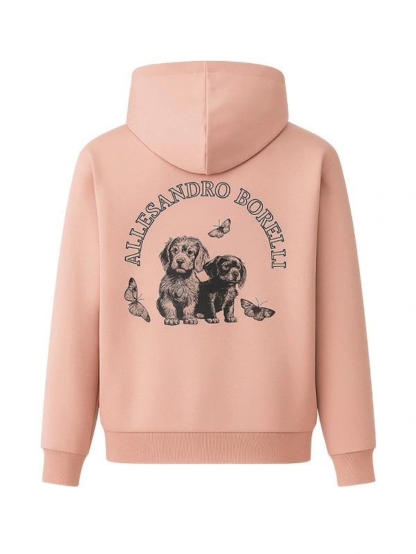 Толстовка для девочки Alessandro Borelli — очаровательная и уютная модель, сочетающая мягкость, стиль и фирменный характер бренда. Изготовлена из приятной на ощупь качественной хлопковой ткани, что делает модель комфортной в прохладную погоду. На передней части расположена изящная надпись Alessandro Borelli, а на спинке — милый принт с двумя щенками и бабочками, придающий образу нежность и позитив. Капюшон со шнурками, застёжка-молния и карманы-кенгуру делают модель практичной и удобной для повседневной носки.