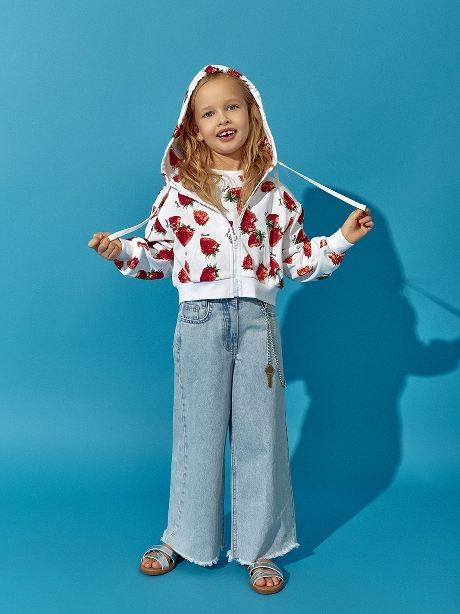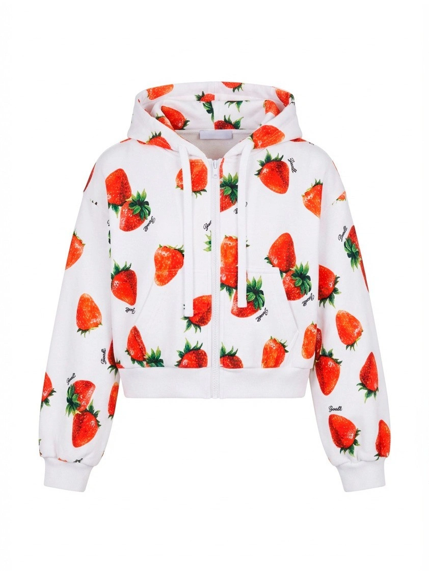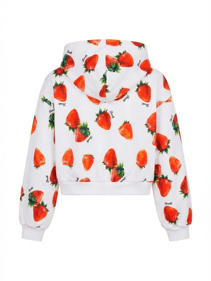 Белая укороченная толстовка Borelli с клубничным принтом для девочек. Яркая укороченная толстовка белого цвета выполнена из мягкого трикотажа с капюшоном, удобными карманами, застежкой-молнией и эластичными манжетами. Реалистичный принт с сочными красными клубниками и зелеными листьями по всей поверхности создает свежий летний образ. Между ягодами — изящные надписи "Borelli" курсивом. Укороченный силуэт идеально сочетается с джинсами и юбками с высокой посадкой. Универсальная толстовка для весенне-летнего сезона. Качественный материал обеспечивает комфорт.
