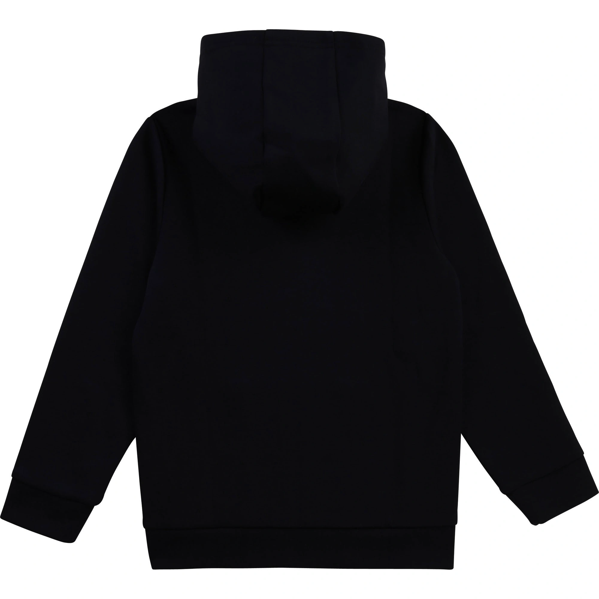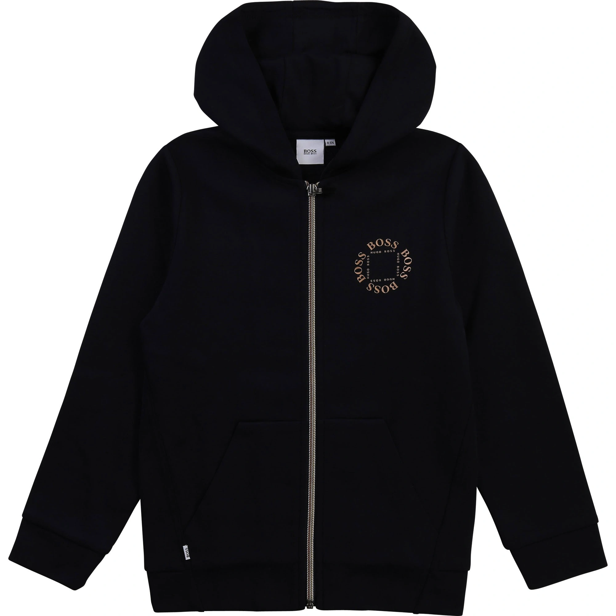 Принт с логотипом на груди, классический капюшон, застежка на молнии спереди, длинные рукава, рукава с узкими манжетами и два прорезных кармана по бокам.