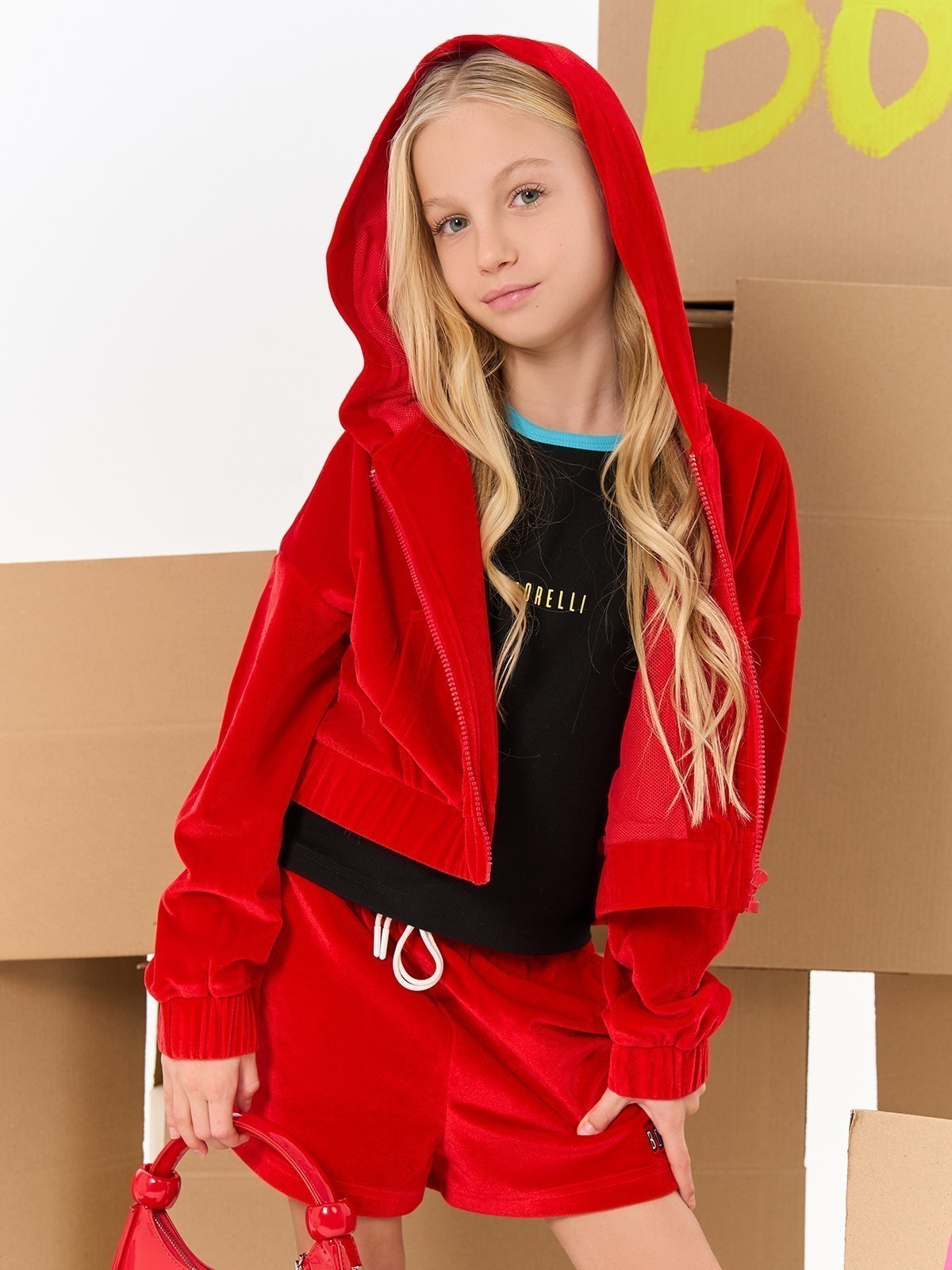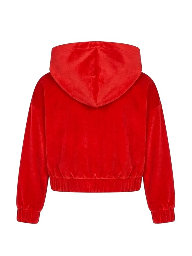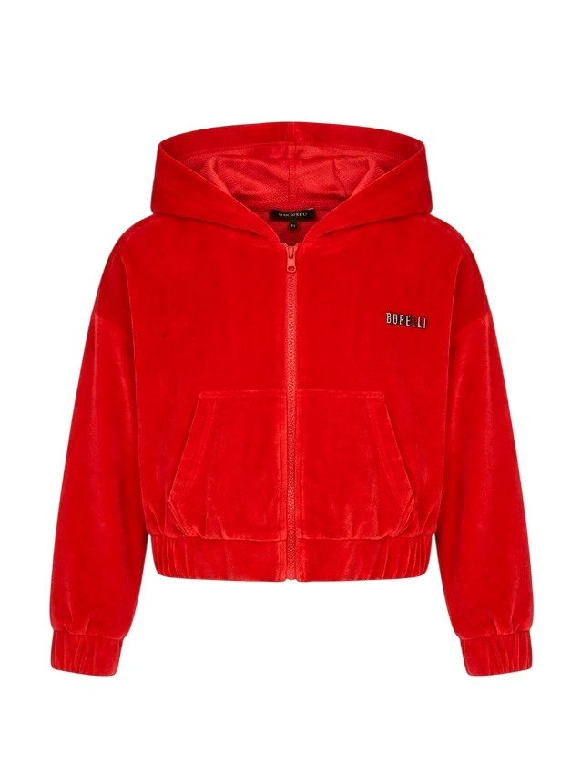 Укороченная велюровая толстовка с капюшоном для девочек. Яркая толстовка насыщенного красного цвета выполнена из мягкого велюра. Модель с капюшоном, застежкой-молнией по всей длине, карманами и эластичными манжетами. Бархатистый велюр создает роскошный образ. На груди справа — небольшая белая надпись "BORELLI". Укороченный силуэт с резинкой по низу подчеркивает талию. Универсальная толстовка отлично сочетается с джинсами и юбками с высокой посадкой.