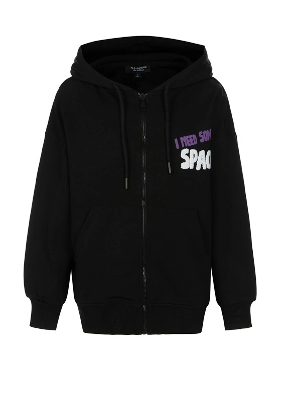 Толстовка ALESSANDRO BORELLI для мальчика выполнена в черном цвете. Модель обладает длинными рукавами, глубоким капюшоном, а также манжетами на рукавах и планкой по низу изделия. На задней части изделия изображены инопланетяне в стиле граффити — синие, розовые и жёлтые, с выразительными глазами и необычными деталями, придающими изображению футуристическую атмосферу. Под изображением можно заметить слово "SPACE", выполненное в стиле уличного искусства. Толстовка будет удобна для прогулок или занятий спортом. Худи выполнено из приятного к телу материала с большим добавлением хлопка. Модель для мальчика не боится частых стирок: ткань не выцветает и не заламывается. Хорошо подойдет для активного отдыха.