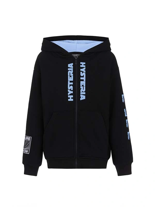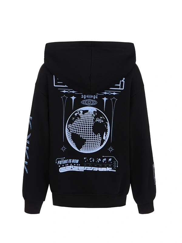 Толстовка ALESSANDRO BORELLI для мальчика выполнена в черном цвете. Модель обладает длинными рукавами, глубоким капюшоном, а также манжетами на рукавах и планкой по низу изделия. Застежка на молнии и удобные карманы обеспечивают комфортную посадку. На задней части изображён крупный графический принт в стиле киберпанк с элементами технологии и футуристической архитектуры. Оригинальный принт дополнен надписями "FUTURE IS NOW" и "BORELLI". Толстовка будет удобна для прогулок или занятий спортом. Она выполнена из приятного к телу материала с большим добавлением хлопка. Модель для мальчика не боится частых стирок: ткань не выцветает и не заламывается. Хорошо подойдет для активного отдыха.