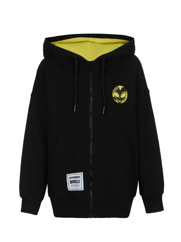 Толстовка ALESSANDRO BORELLI для мальчика выполнена в черном цвете. Модель обладает длинными рукавами, глубоким капюшоном, а также манжетами на рукавах и планкой по низу изделия. На передней части изделия две нашивки: силиконовый инопланетянин в чёрном круге и текстильная надпись «Alessandro Borelli ESTD 2025». Толстовка будет удобна для прогулок или занятий спортом. Худи выполнено из приятного к телу материала с большим добавлением хлопка. Модель для мальчика не боится частых стирок: ткань не выцветает и не заламывается. Хорошо подойдет для активного отдыха.