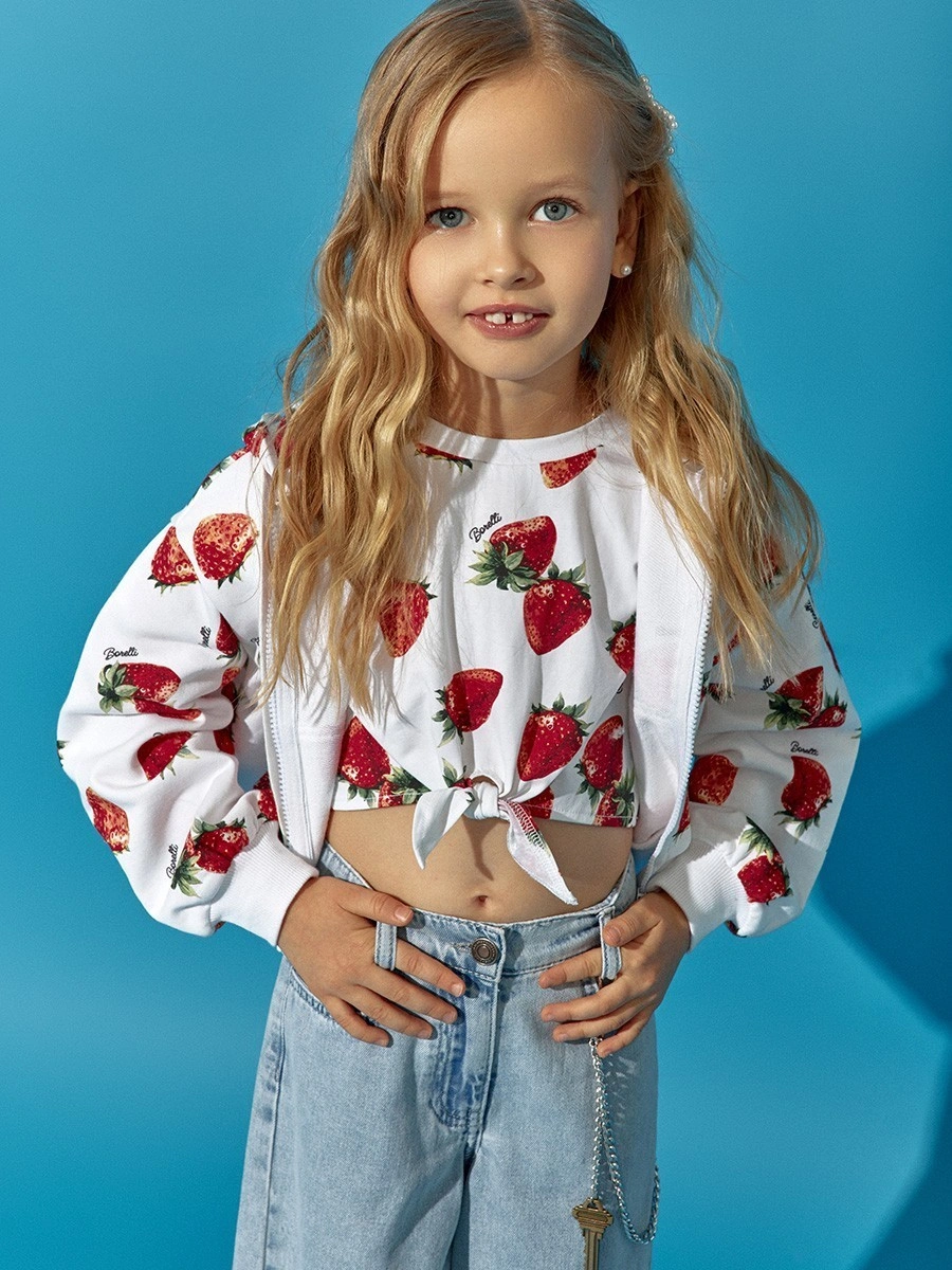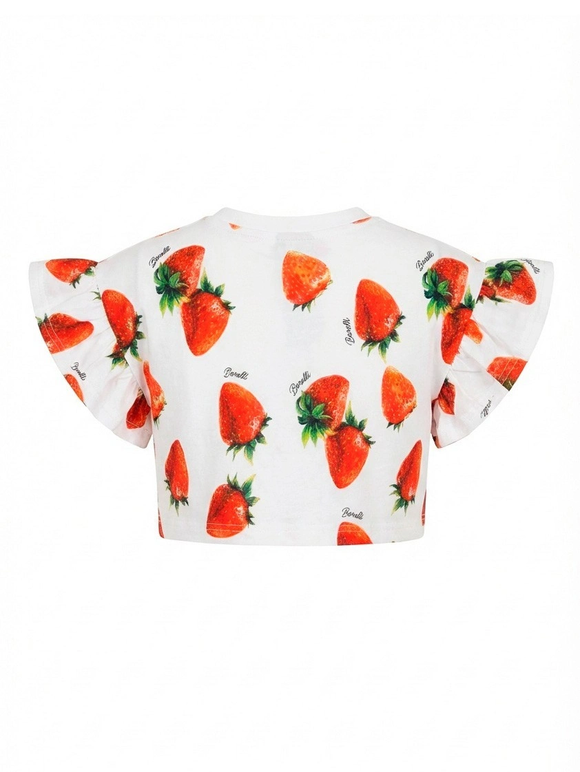 Белый топ Alessandro Borelli с клубничным принтом и рюшами для девочек. Очаровательный укороченный топ белого цвета с ярким летним дизайном. Модель выполнена из мягкого хлопкового трикотажа с круглым вырезом и воздушными рукавами-крылышками с рюшами. Топ украшен реалистичным принтом с сочными красными клубниками и зелеными листьями по всей поверхности. Между ягодами — изящные надписи "Borelli" курсивом. Завязки спереди позволяют регулировать посадку и создавать стильный силуэт. Романтичная модель идеально сочетается с юбками, шортами и джинсами с высокой посадкой. Женственный крой с рюшами добавляет образу нежности. Качественный материал обеспечивает комфорт в жаркие дни.