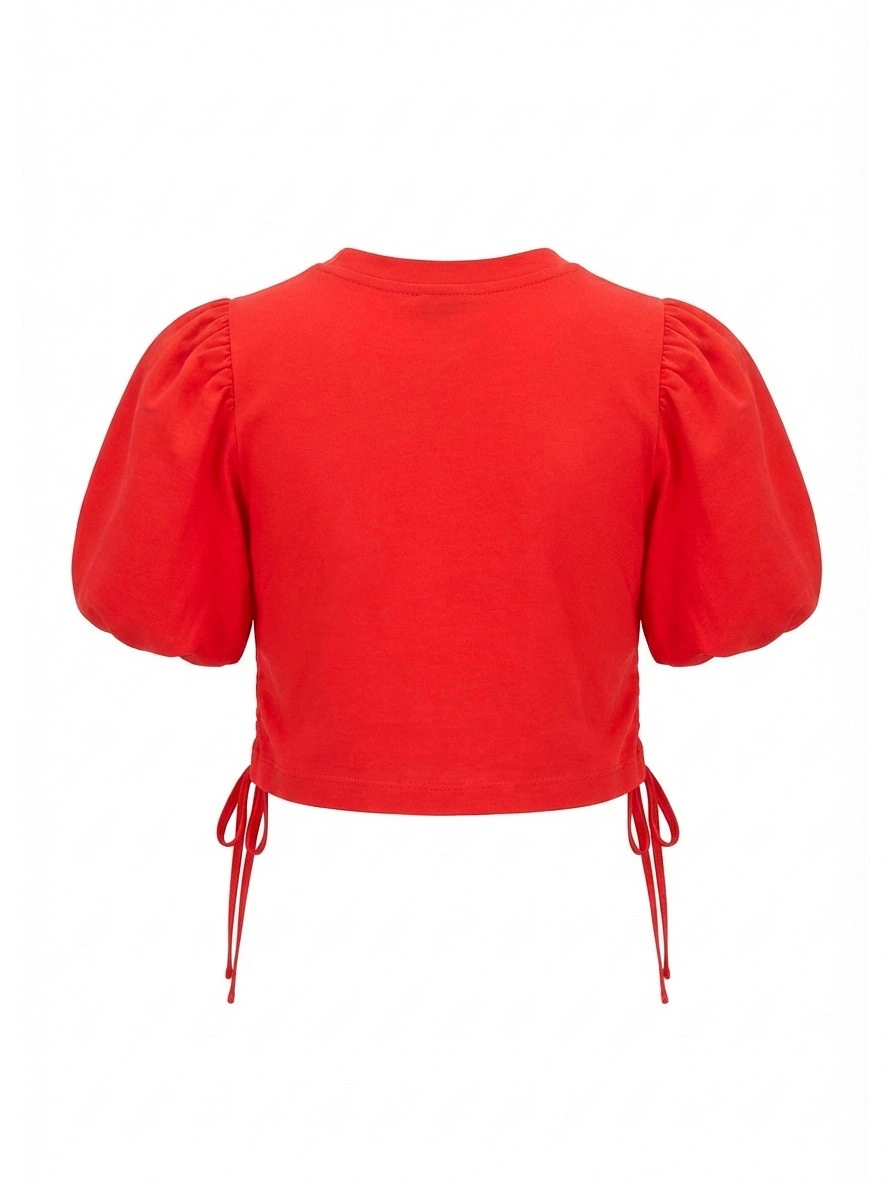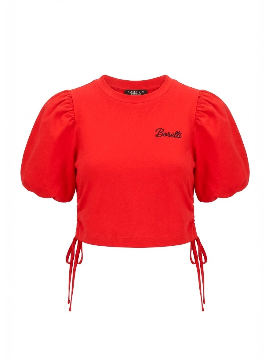 Красный укороченный топ с объемными рукавами для девочек. Стильный укороченный топ ярко-красного цвета выполнен из мягкого трикотажа с круглым вырезом и эффектными объемными рукавами-буфами. На груди — небольшая курсивная надпись с логотипом "Borelli". По бокам — шнурки-завязки, позволяющие регулировать ширину и создавать присборенный силуэт. Укороченный крой подчеркивает талию. Романтичная модель идеально сочетается с джинсами и юбками с высокой посадкой, шортами. Объемные рукава добавляют образу нарядности. Качественный материал обеспечивает комфорт.