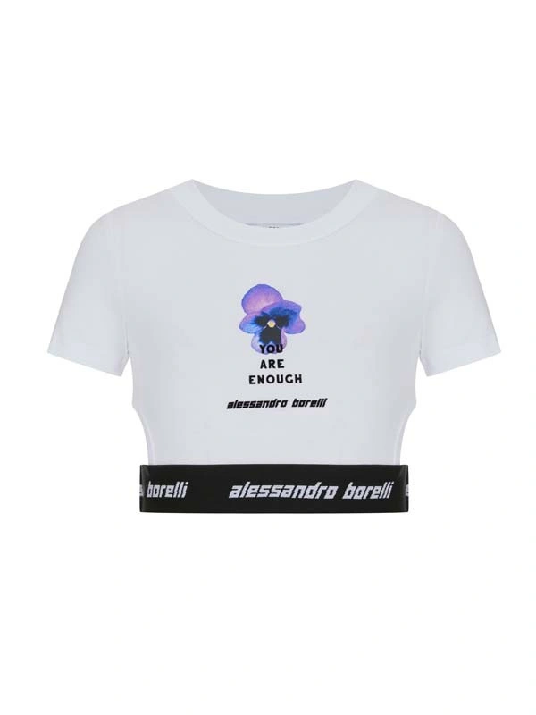 Топ ALESSANDRO BORELLI для девочек – лучший выбор для лета и теплой весны. На груди расположен яркий принт в виде фиалки, а также бархатные надписи "YOU ARE ENOUGH" и "alessandro borelli". По нижнему краю топа проходит чёрная резинка с белой надписью "alessandro borelli", выступающая элементом декора и дополнительной фиксации. Качественная мягкая ткань долго сохраняет свою яркость и не выцветает после стирки. Топ отлично подойдет для прогулок, отдыха или занятий спортом. Прекрасно сочетается с любой спортивной одеждой и другими моделями из коллекции.