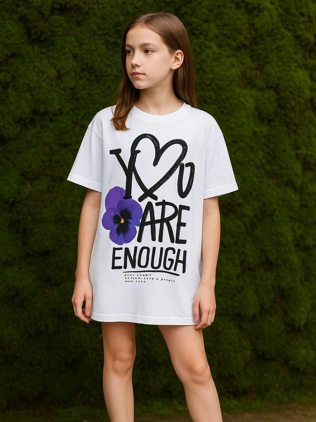 Футболка - туника ALESSANDRO BORELLI для девочки идеально сочетается как с другими моделями из коллекции Violet, так и с базовыми джинсами или шортами. Модель свободного кроя выполнена в стиле casual. Футболка-туника в белом цвете украшена ярким принтом в виде фиалки. На передней части футболки расположена крупная надпись "YOU ARE ENOUGH", выполненная в контрастном чёрном цвете со стразами. Приятная ткань с большим добавлением хлопка делает футболку с коротким рукавом лучшим вариантом для любого сезона. Строго ухода она не требует: после стирки рисунок останется таким же ярким. В ней можно смело гулять, отдыхать или заниматься спортом.