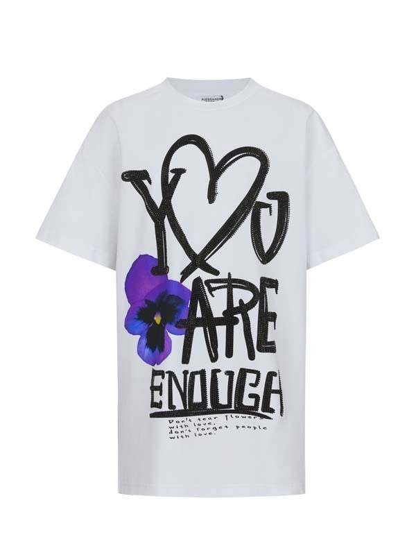 Футболка - туника ALESSANDRO BORELLI для девочки идеально сочетается как с другими моделями из коллекции Violet, так и с базовыми джинсами или шортами. Модель свободного кроя выполнена в стиле casual. Футболка-туника в белом цвете украшена ярким принтом в виде фиалки. На передней части футболки расположена крупная надпись "YOU ARE ENOUGH", выполненная в контрастном чёрном цвете со стразами. Приятная ткань с большим добавлением хлопка делает футболку с коротким рукавом лучшим вариантом для любого сезона. Строго ухода она не требует: после стирки рисунок останется таким же ярким. В ней можно смело гулять, отдыхать или заниматься спортом.