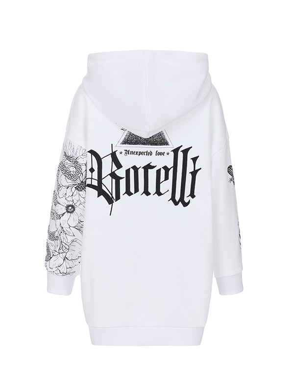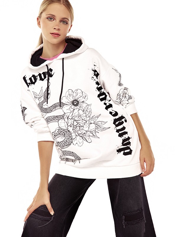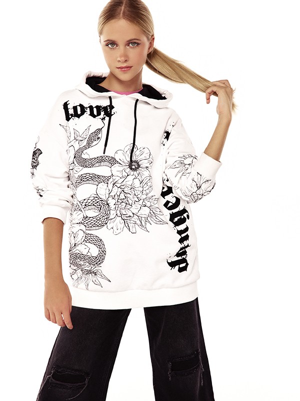 Худи-туника ALESSANDRO BORELLI для девочек выполнена в стиле коллекции Snakes. Модель в белом цвете и украшена контрастными принтами. На передней части изображена змея, проползающая между цветочными узорами, а надписи «dangerous» и «love» дополняют стильный и современный дизайн. Худи с длинными рукавами имеет глубокий капюшон с черными завязками, манжеты на рукавах и планку по низу изделия. Толстовка будет удобна для прогулок или занятий спортом. Худи выполнено из приятного к телу материала с большим добавлением хлопка. Не боится частых стирок: ткань не выцветает и не заламывается. Хорошо подойдет для активного отдыха.