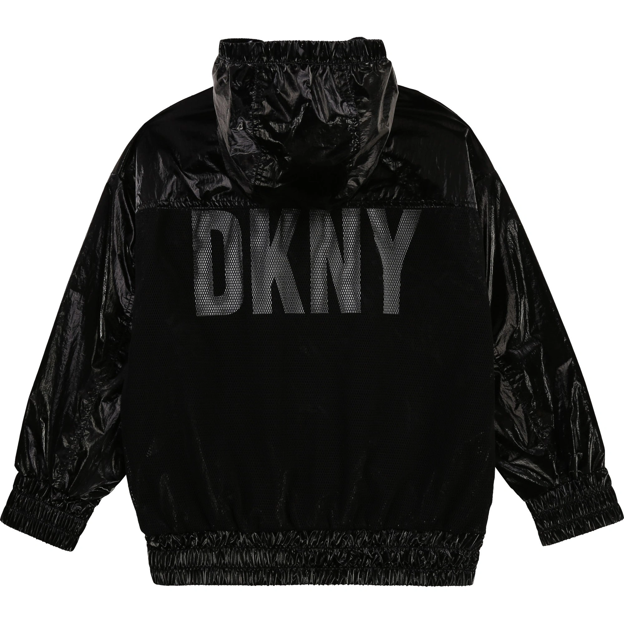 Глянцевая фактура, сетка, логотип спереди, эластичные манжеты, эластичный подол, классический капюшон, потайная застежка спереди, длинные рукава, два нагрудных кармана на молнии и два кармана на молнии по бокам. Цвет: черный.