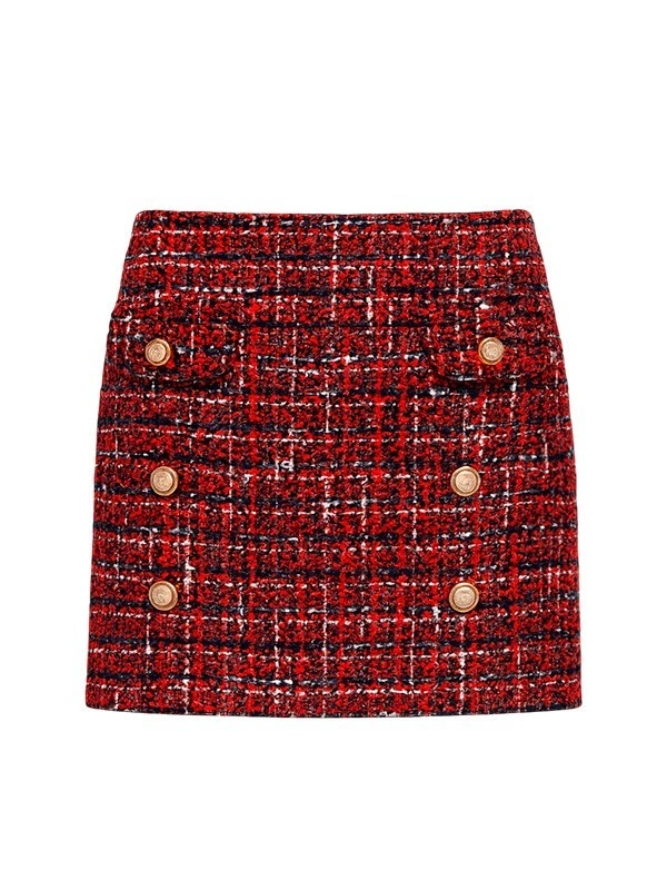 Мини-юбка из благородного красного твида с декоративными золотистыми пуговицами. Элегантная и стильная модель подчёркивает фигуру и гармонично сочетается с жакетом из той же ткани, создавая эффектный костюмный ансамбль.
