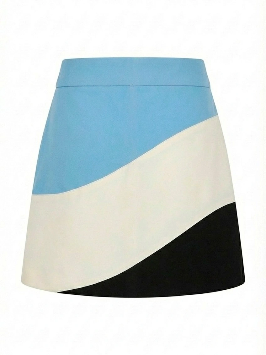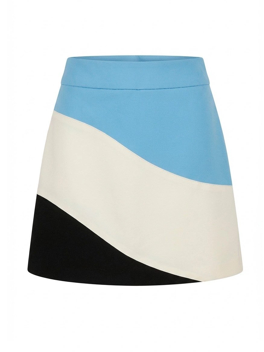 Юбка в стиле колор-блок для девочек. Стильная юбка А-силуэта в технике колор-блок с эффектным сочетанием голубого, белого и черного цветов выполнена из качественной плотной ткани. Асимметричный дизайн с крупными цветовыми блоками, расположенными по диагонали, создает современный динамичный образ. Трапециевидный силуэт визуально стройнит. Длина выше колена. Универсальная юбка для прогулок и отдыха. Отлично сочетается с футболками, блузами, свитшотами и свитерами. Качественный материал обеспечивает комфорт и свободу движений.