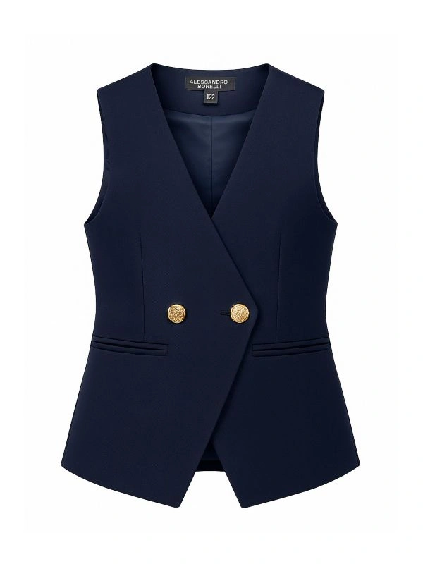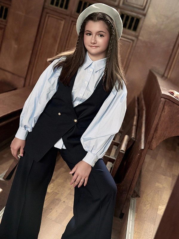 Жилет ALESSANDRO BORELLI для девочек выполнен в классическом стиле в тёмно-синем цвете. Приталенная модель без рукавов, с глубоким V-образным вырезом. Застёгивается на золотистую пуговицу спереди. На передней части изделия расположены два декоративных кармана. Модель аккуратно сидит по фигуре и отлично подходит для школьной формы, придавая образу строгости и опрятности. Жилет выполнен из качественной ткани с большим добавлением вискозы, что позволяет с комфортом посещать занятия или торжественные мероприятия.
