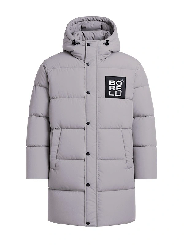 Удлинённый пуховик BORELLI в актуальном оттенке серого изготовлен из прочной водо- и ветронепроницаемой ткани, которая устойчива к загрязнениям и легко очищается. Утеплитель обеспечивает отличную терморегуляцию, сохраняя тепло даже при низких температурах. Дизайн сочетает лаконичность и спортивную динамику: спереди — фирменный логотип BORELLI в чёрном квадрате, на спине — крупная вертикальная надпись бренда. Капюшон с утяжкой защищает от ветра, а удобная застёжка на кнопках и молнии обеспечивает надёжную посадку.
