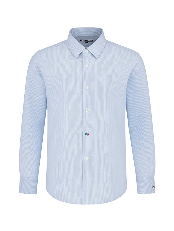 Рубашка ALESSANDRO BORELLI для мальчиков – идеальное решение для школьных будней. Модель из гладкой классической ткани с длинным рукавом в мелкую голубую полоску имеет отложной воротник, застежку на пуговицы, манжеты на рукавах, а также одна пуговица декорирована цветом итальянского флага – это символизирует, что дизайн модели был разработан в Италии. Сорочка для мальчика будет идеально сочетаться как с брюками, так и с жилетом или пиджаком. Рубашка выполнена из мягкой бамбуковой ткани, что позволяет с комфортом посещать занятия или торжественные мероприятия. За ей не нужно постоянно ухаживать, после стирки ткань не теряет форму и цвет.